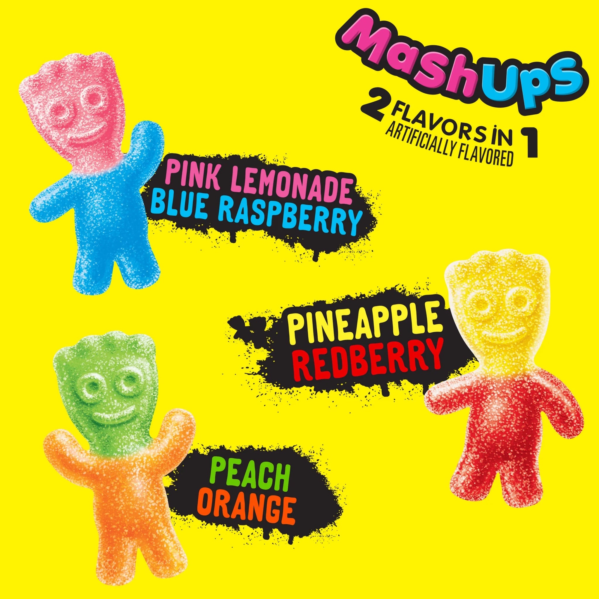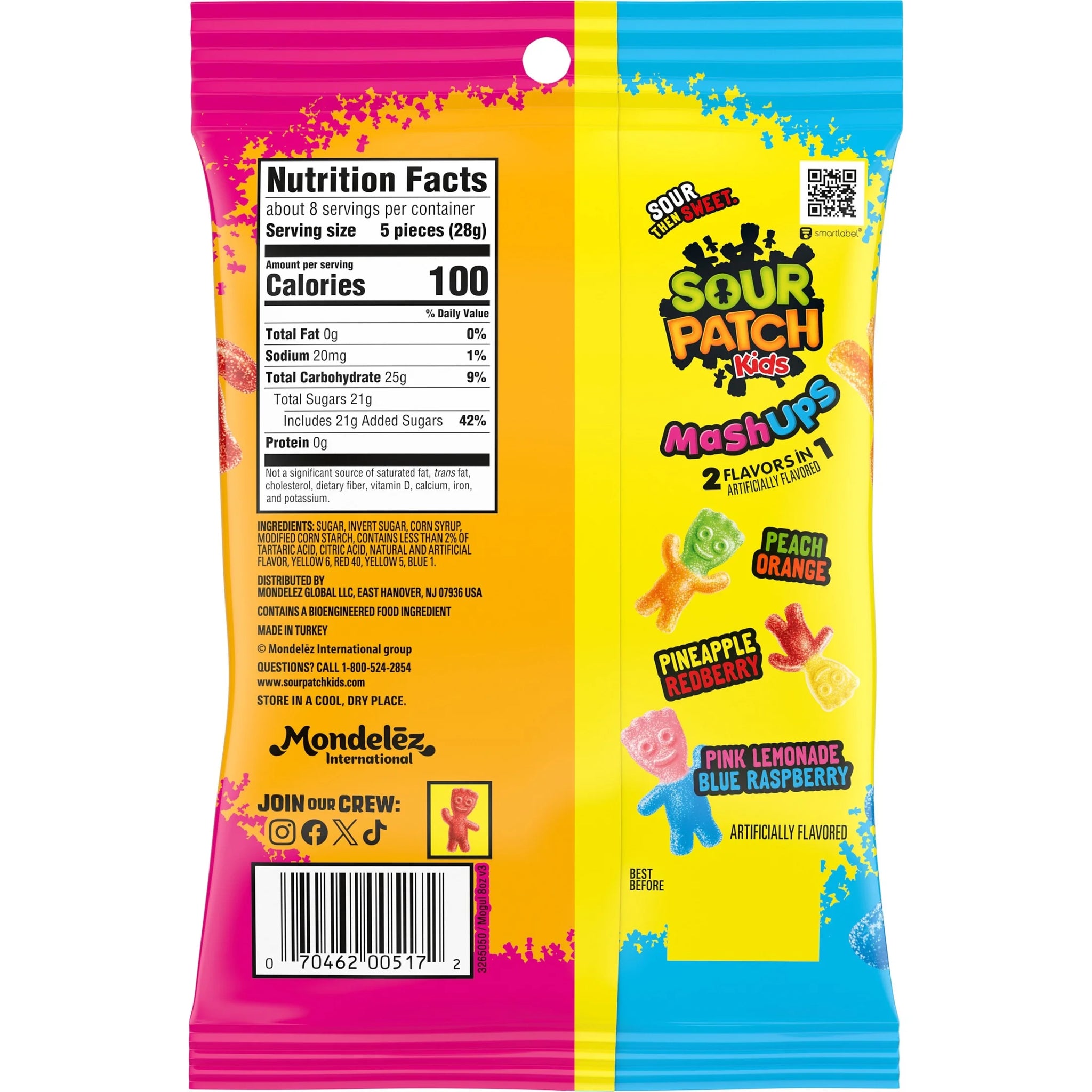 Sour gummy candy packed with a flavorful punch, SOUR PATCH KIDS MashUps 2 Flavors in 1 Soft & Chewy Candy bursts with two SOUR THEN SWEET flavors in one piece of candy for a tasty twist to your candy experience. These kid-shaped sour gummies are two times bigger than regular SOUR PATCH KIDS for twice the mischief and a supersized sour candy experience in flavor combinations like pink lemonade blue raspberry, pineapple redberry, and peach orange. The bagged candy is great for tossing in purses, backpacks, and lunchboxes, making it a convenient choice for on the go snacks.