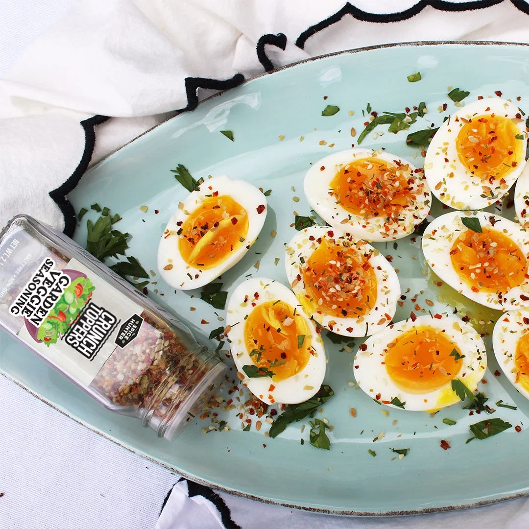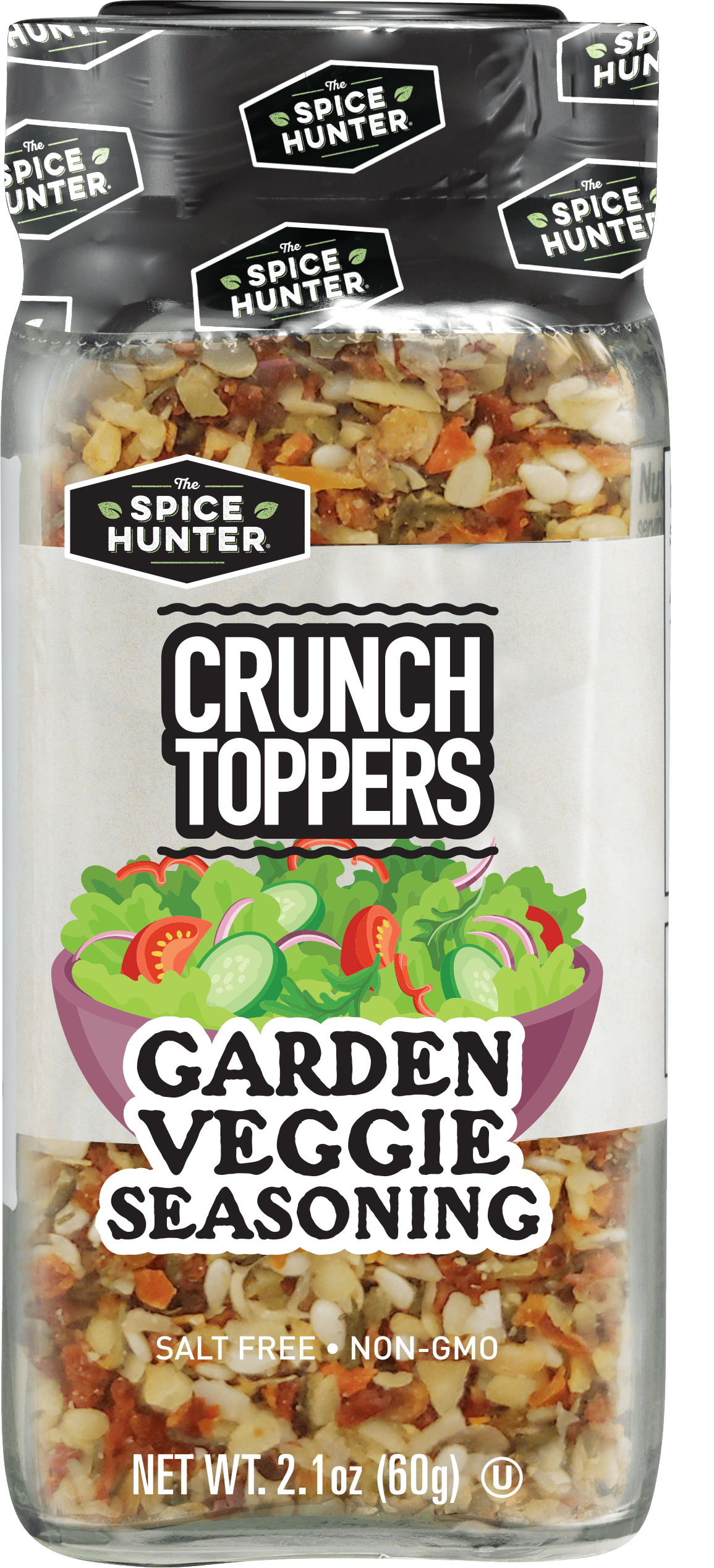 1. The Spice Hunter Garden Veggie Crunch Seasoning Blend delivers a new crunchy seasoning featuring delicious garden veggies. 2. 2.1 Ounces 3. All the crunch for all your salad needs. 4. This crunch topper is a perfect companion for our favorite Veggie and Feta Salad. 5. All our Crunch Toppers are Salt Free, Non-GMO, Gluten-free and Kosher Ingredients: Sesame seeds, golden flax seeds, carrots, hemp seeds, bell pepper, tomato, onion, garlic, chives
