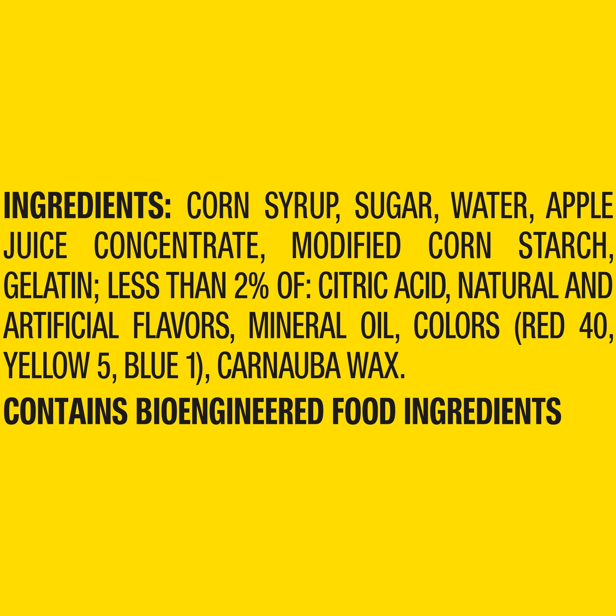 CORN SYRUP, SUGAR, WATER, APPLEJUICE CONCENTRATE, MODIFIED CORN STARCH,GELATIN; LESS THAN 2% OF: CITRIC ACID, NATURAL ANDARTIFICIAL FLAVORS, MINERAL OIL, COLORS (RED 40,YELLOW 5, BLUE 1), CARNAUBA WAX./div>