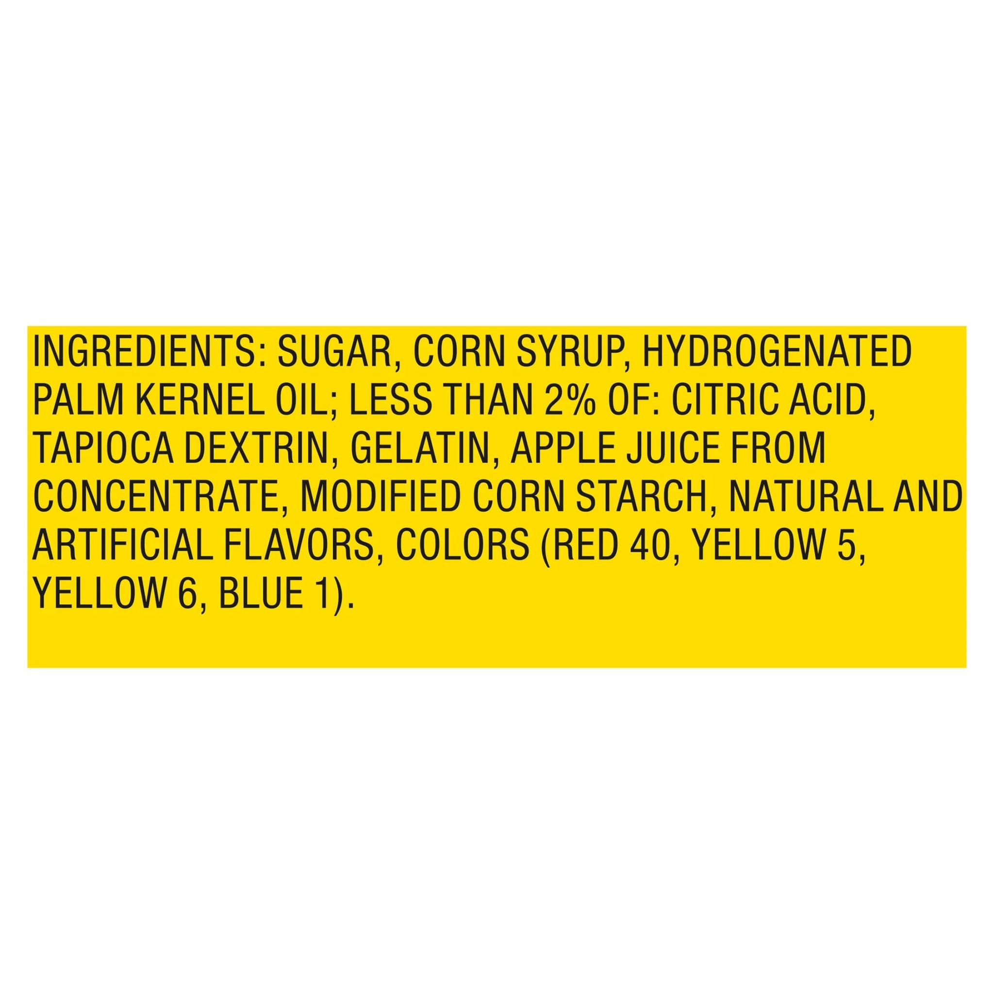 Sugar, Corn Syrup, Hydrogenated Palm Kernel Oil; Less than 2% of: Citric Acid, Tapioca Dextrin, Gelatin, Apple Juice from Concentrate, Modified Corn Starch, Natural and Artificial Flavors, Colors (Red 40, Yellow 5, Yellow 6, Blue 1)./div>