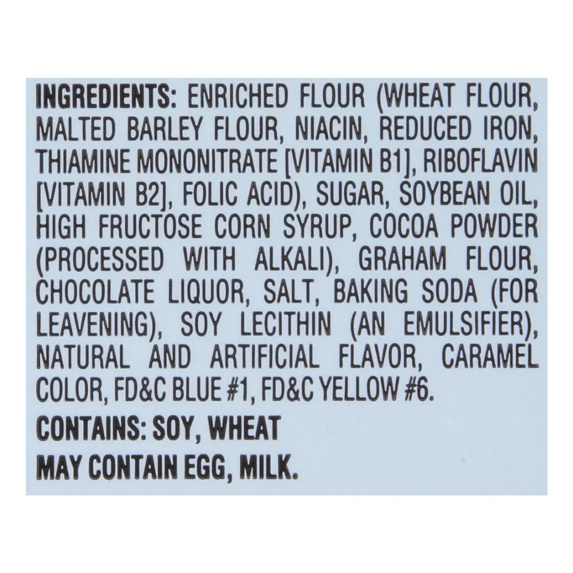 Enriched Flour (Wheat Flour, Malted Barley Flour, Niacin, Reduced Iron, Thiamine Mononitrate [Vitamin B1], Riboflavin [Vitamin B2], Folic Acid), Sugar, Soybean Oil, High Fructose Corn Syrup, Cocoa Powder (processed with Alkali), Graham Flour, Chocolate Liquor, Salt, Baking Soda (for leavening), Soy Lecithin (an emulsifier), Natural and Artificial Flavor, CarameL Color, FD&C Blue #1, FD&C Yellow #6/div>