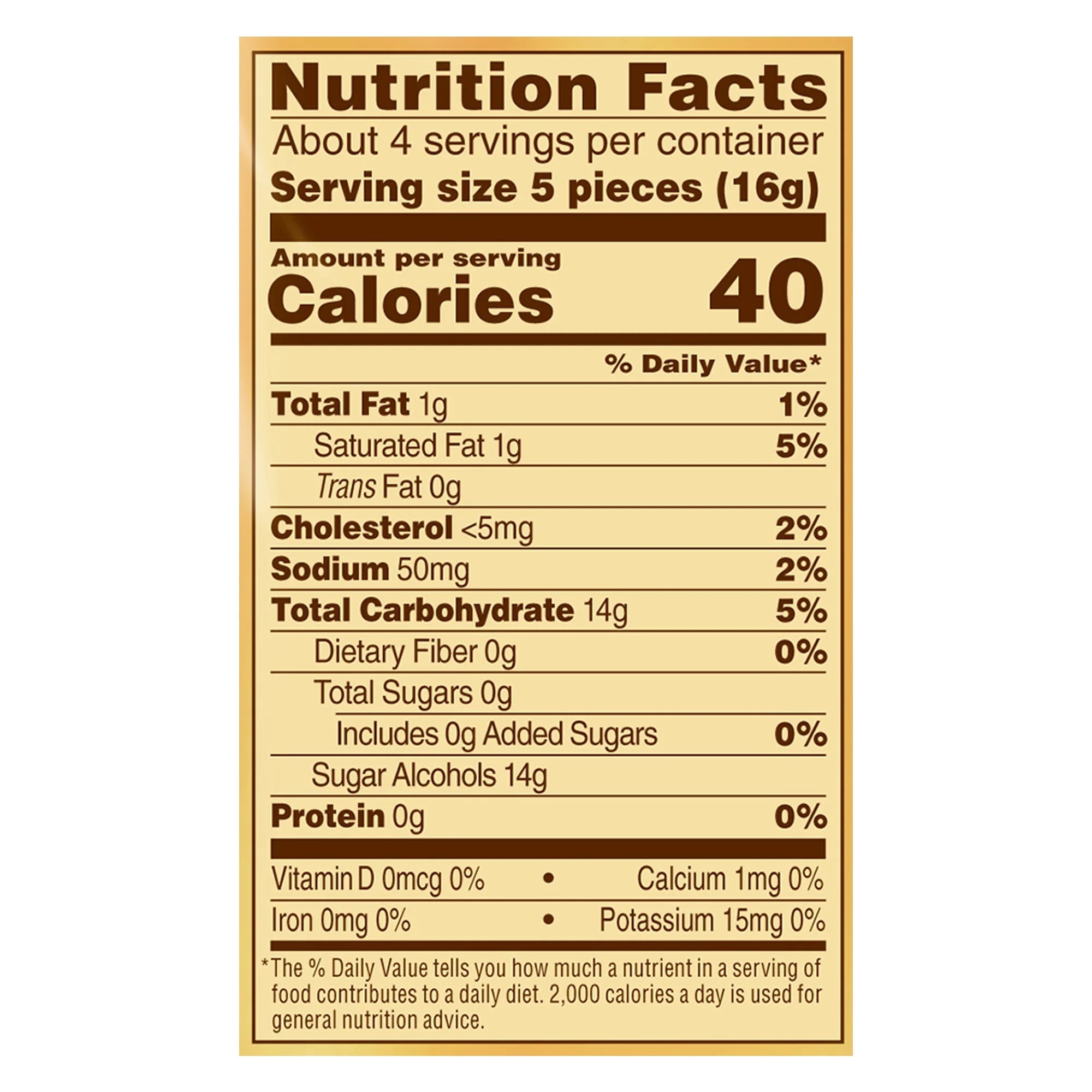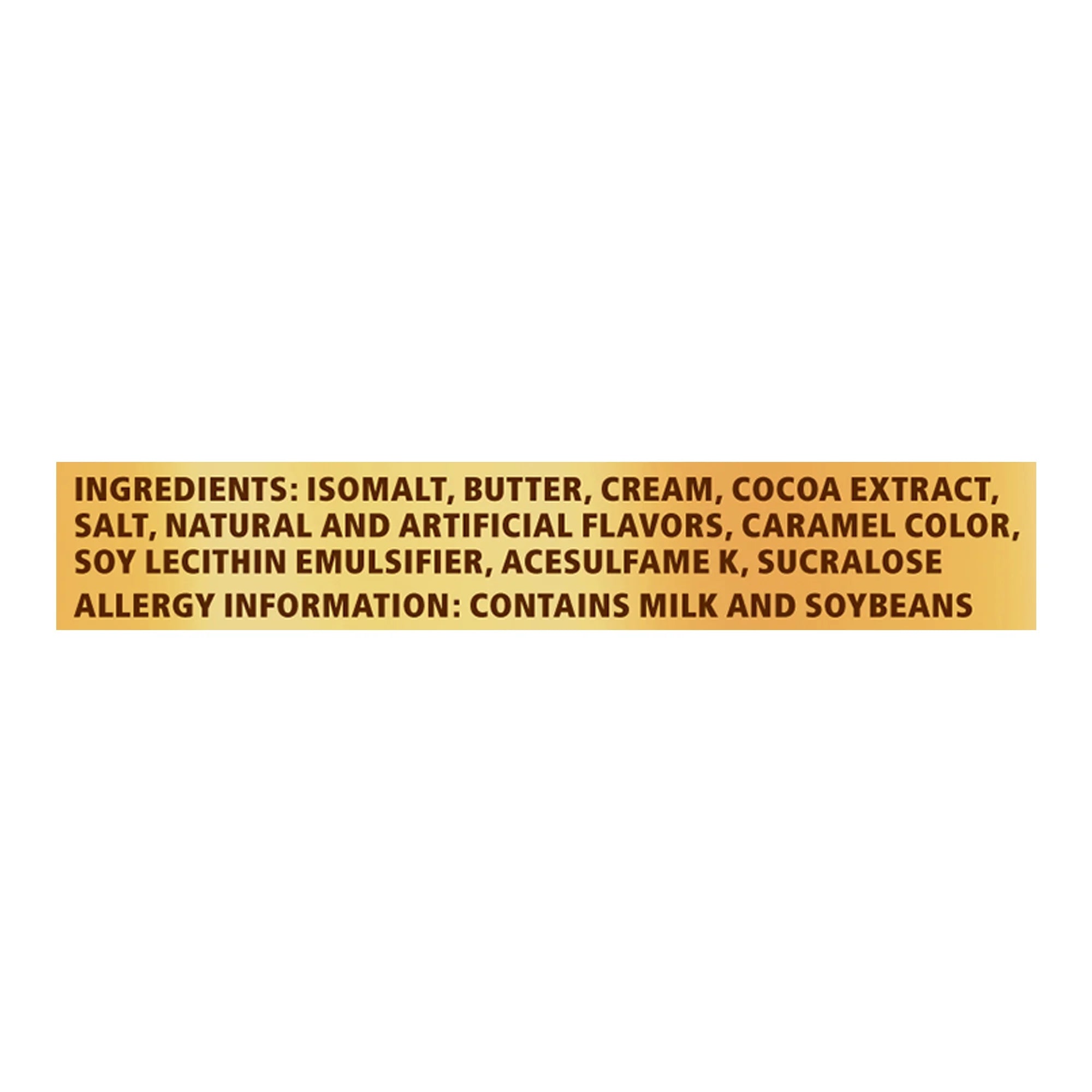 Isomalt, Butter, Cream, Cocoa Extract, Salt, Natural and Artificial Flavors, Caramel Color, Soy Lecithin Emulsifier, Acesulfame K, Sucralose./div>