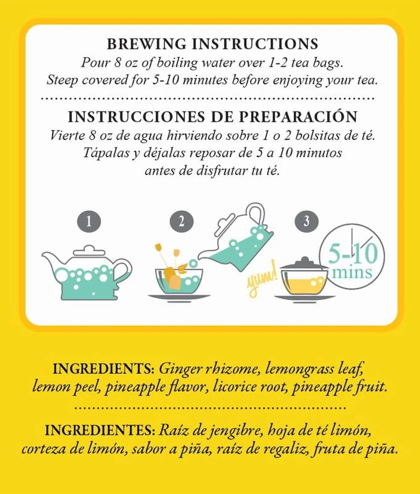 • DECAF TEA BAGS: Pineapple Ginger Tea is a skillfully crafted caffeine free tea blend of ginger rhizome, lemongrass leaf, lemon peel, pineapple flavor, licorice root and pineapple fruit. Comes in tea bags individually wrapped.