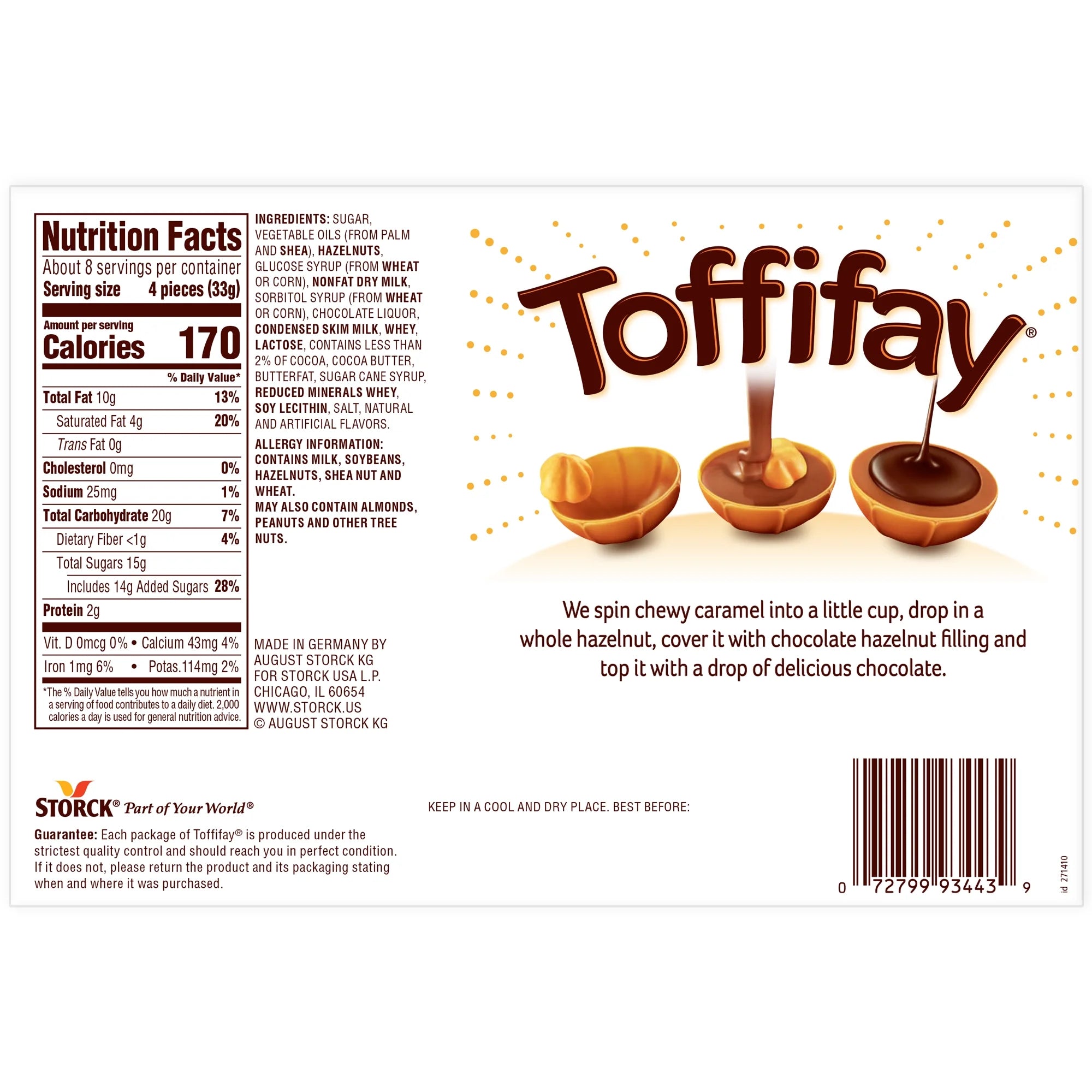 Toffifay candy is a combination that's perfect for every taste; a chewy caramel candy cup, a whole hazelnut, chocolate hazelnut filling and a drop of delicious chocolate. Toffifay is enjoyed by people in more than one hundred countries around the world. Served up in a distinctive golden tray, Toffifay takes you out of the ordinary with its wondrous array of flavors and textures in every deeply satisfying bite. This 24 piece box of Toffifay candy that's perfect for gifting at Christmas or around the holiday season.