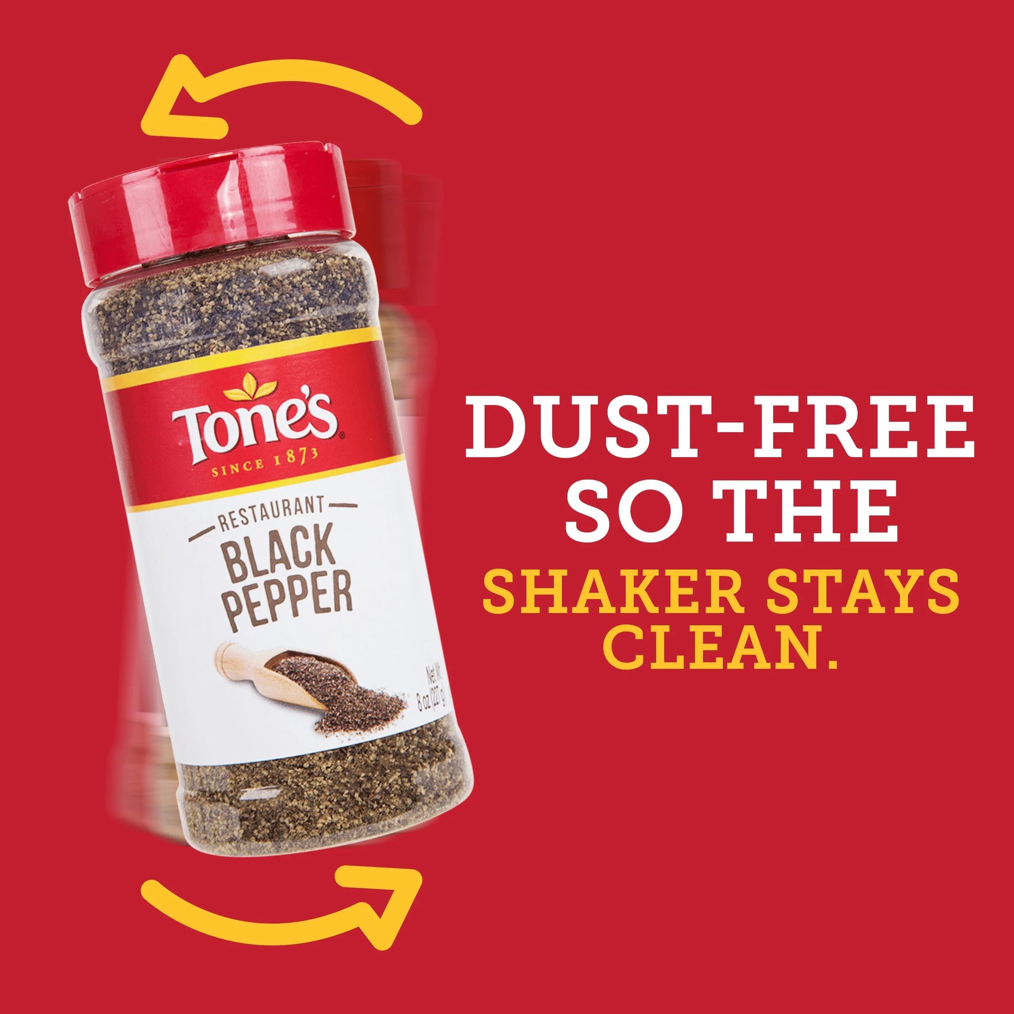 This 8 ounce bottle of Tone's Restaurant Black Pepper is a wonderful addition to your kitchen pantry. Tone’s Restaurant Black Pepper is ground slightly courser than regular ground black pepper, without any dust. The sides of the pepper shaker stay clean and clear. Established in 1873, Tone’s is the oldest spice in America whose focus on delivering quality spices at a value has stood the test of time. This plastic bottle of Tone's Restaurant Black Pepper is shelf-stable/ambient and does not contain any of the 9 major food allergens.