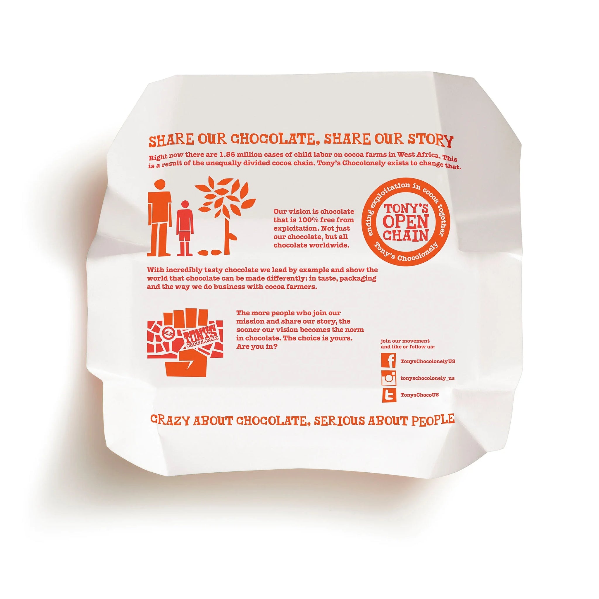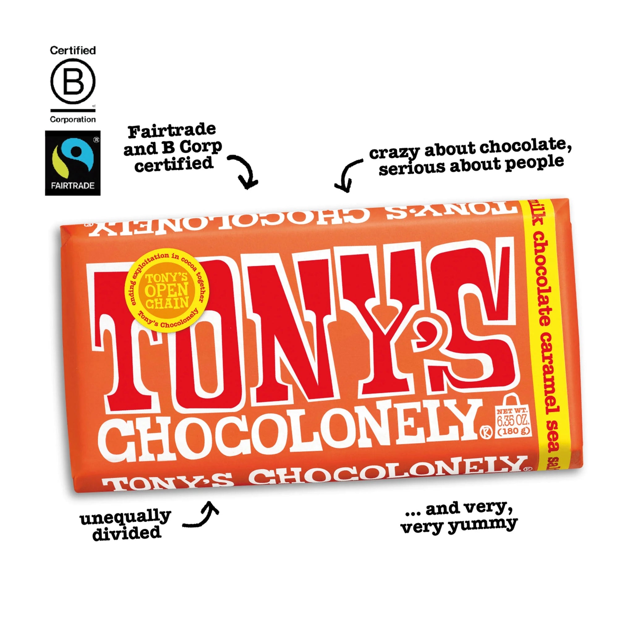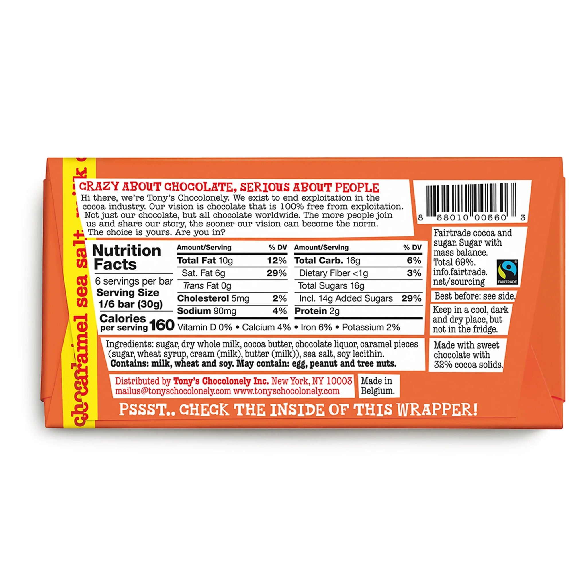 Sweet, salty, and oh-so-tasty, you’ll savor every bite of this 6.35 oz candy bar. Made with premium milk chocolate, crunchy caramel, and flakes of sea salt, it’s no surprise this bar is Tony’s Chocolonely’s worldwide bestseller. Tony's Milk Chocolate Caramel Sea Salt Bar is at least 2X bigger than other top-selling chocolate bars, meaning 2X more decadent bites per bar. And because Tony’s mission is to end exploitation in the chocolate industry, this premium chocolate bar is made with Fairtrade ingredients. Finally, a sweet treat that doesn’t just taste good — it does good too. Try chopping up your bar for the perfect caramel-infused chocolate chip cookie!