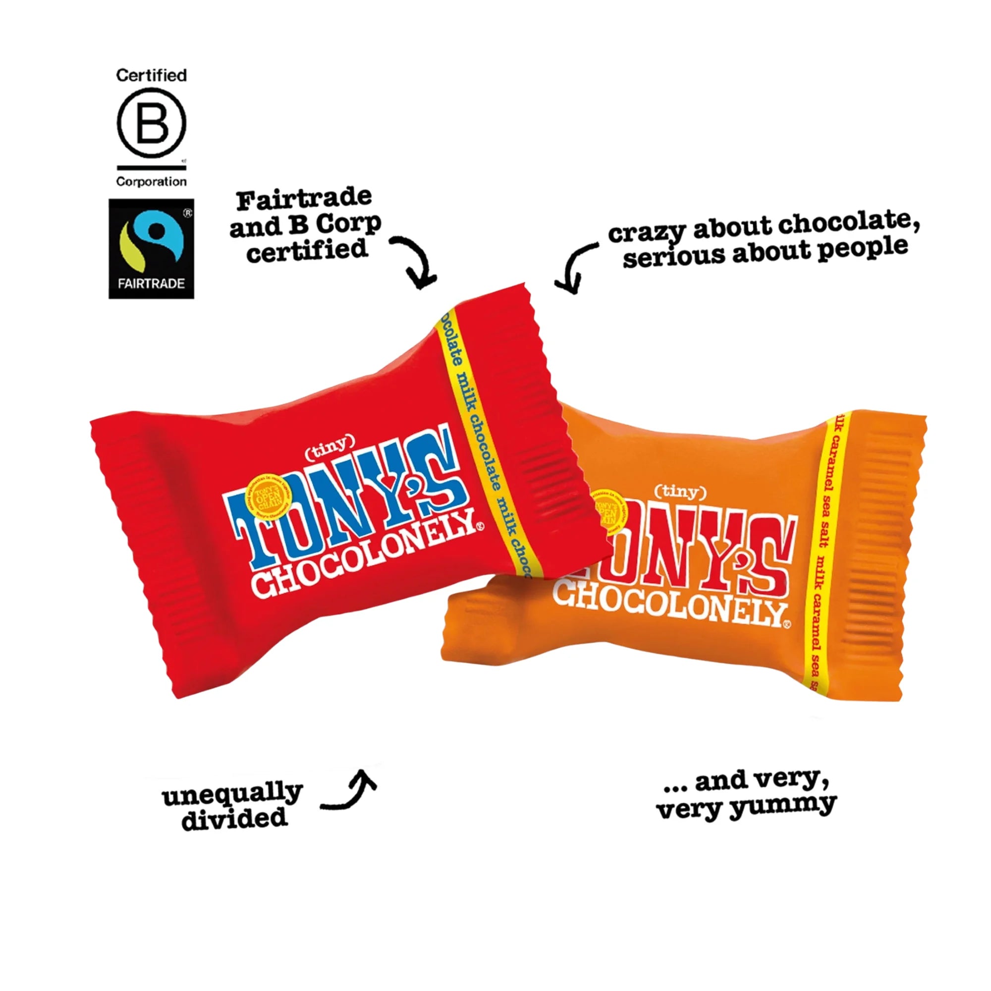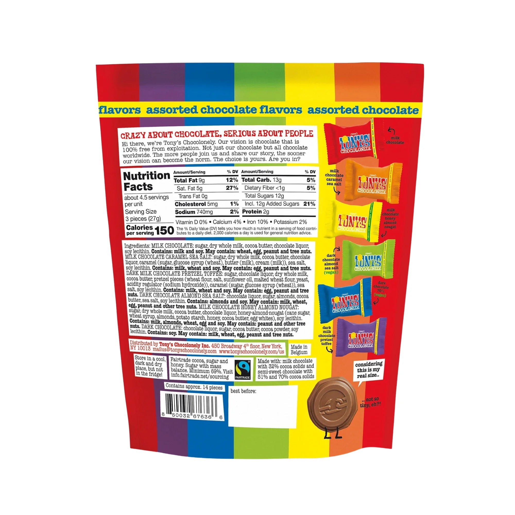 A fun mix of six classic Tony’s flavors in one pouch. Each bite‑size piece is individually wrapped—perfect for snacking or sharing. Includes flavors: Milk Chocolate, Caramel Sea Salt, Honey Almond Nougat, Dark Milk Pretzel Toffee, Dark Chocolate, and Dark Chocolate Almond Sea Salt