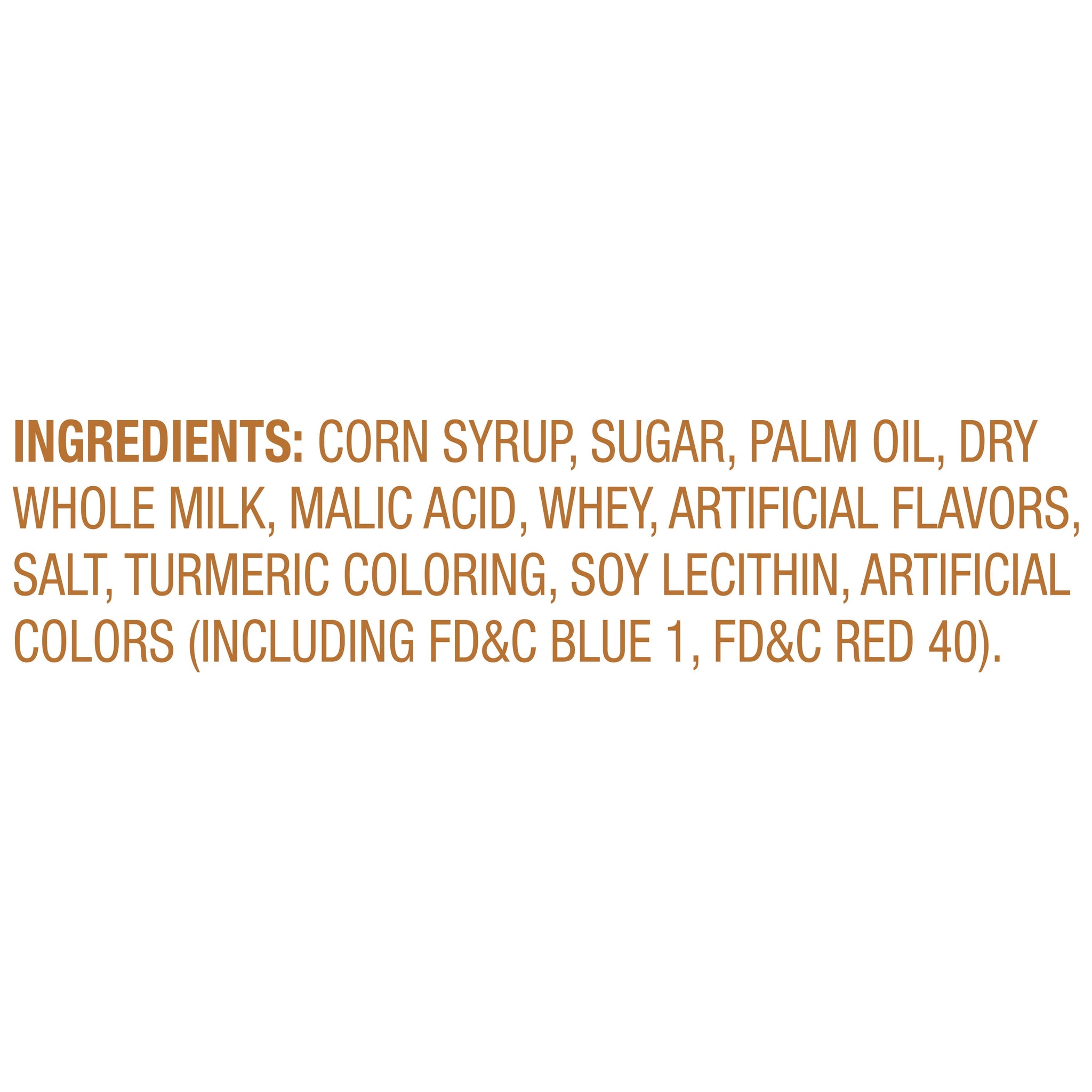 CORN SYRUP, SUGAR, PALM OIL, DRY WHOLE MILK, MALIC ACID, WHEY, ARTIFICIAL FLAVORS, SALT, TURMERIC COLORING, SOY LECITHIN, ARTIFICIAL COLORS (INCLUDING FD&C BLUE 1, FD&C RED 40)./div>