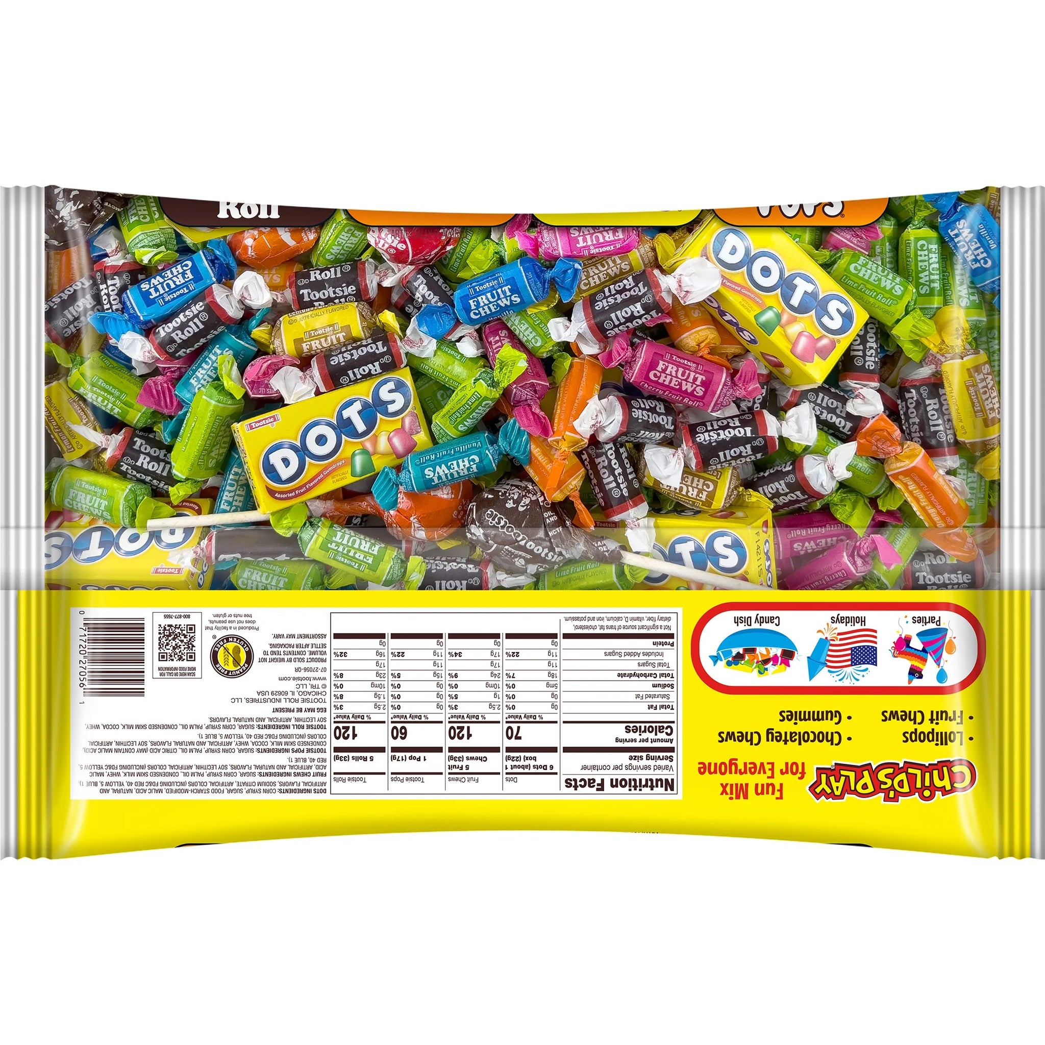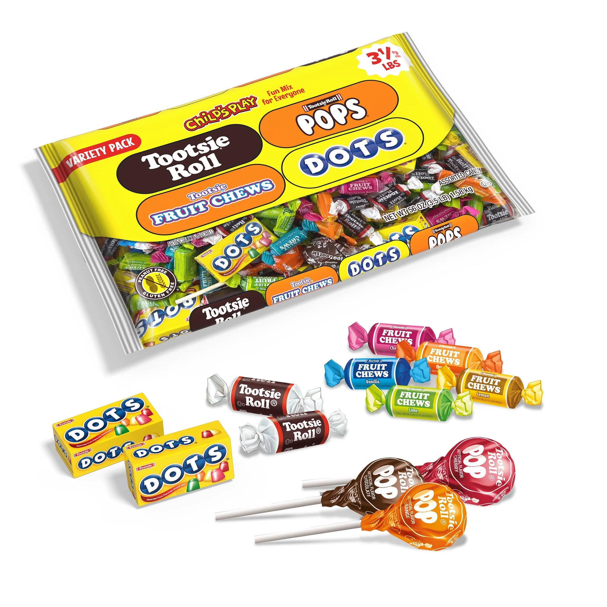 Tootsie Child's Play, Assorted Candy, 56 oz. Individually Wrapped, Peanut Free, Gluten Free, Contains Milk. Looking for a great variety of candy at a value? Looking for classic candy enjoyed by everyone? The Child's Play variety bag meets those needs and MORE! The candy mix offers some of the most popular Tootsie Roll candies - Chocolatey, Chewy Tootsie Rolls; Fruity, Gummy Dots; Tootsie Pops lollipops with Tootsie Roll centers; and Fruity Tootsie Fruit Chews. This gluten-free and peanut-free candy assortment is perfect for trick-or-treating, parties, classrooms, candy dishes, snacking, and more! Everyone's favorite candy is always on-hand with child's play, The world's #1-selling kid's candy Variety bag. Combining the most popular Tootsie Roll Candies in one share-friendly bag, Child's Play is a generous assortment of Tootsie Rolls, Tootsie Pops, Dots and Tootsie Fruit Chews is the ultimate, value-packed candy assortment. Great for kids' Parties, classroom outings, picnics, and most of all, Halloween!