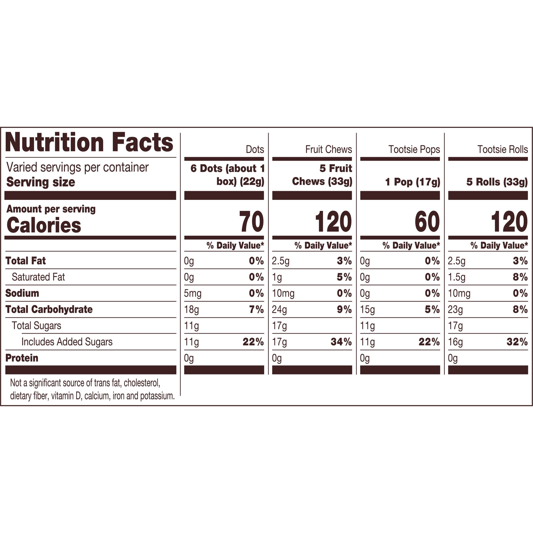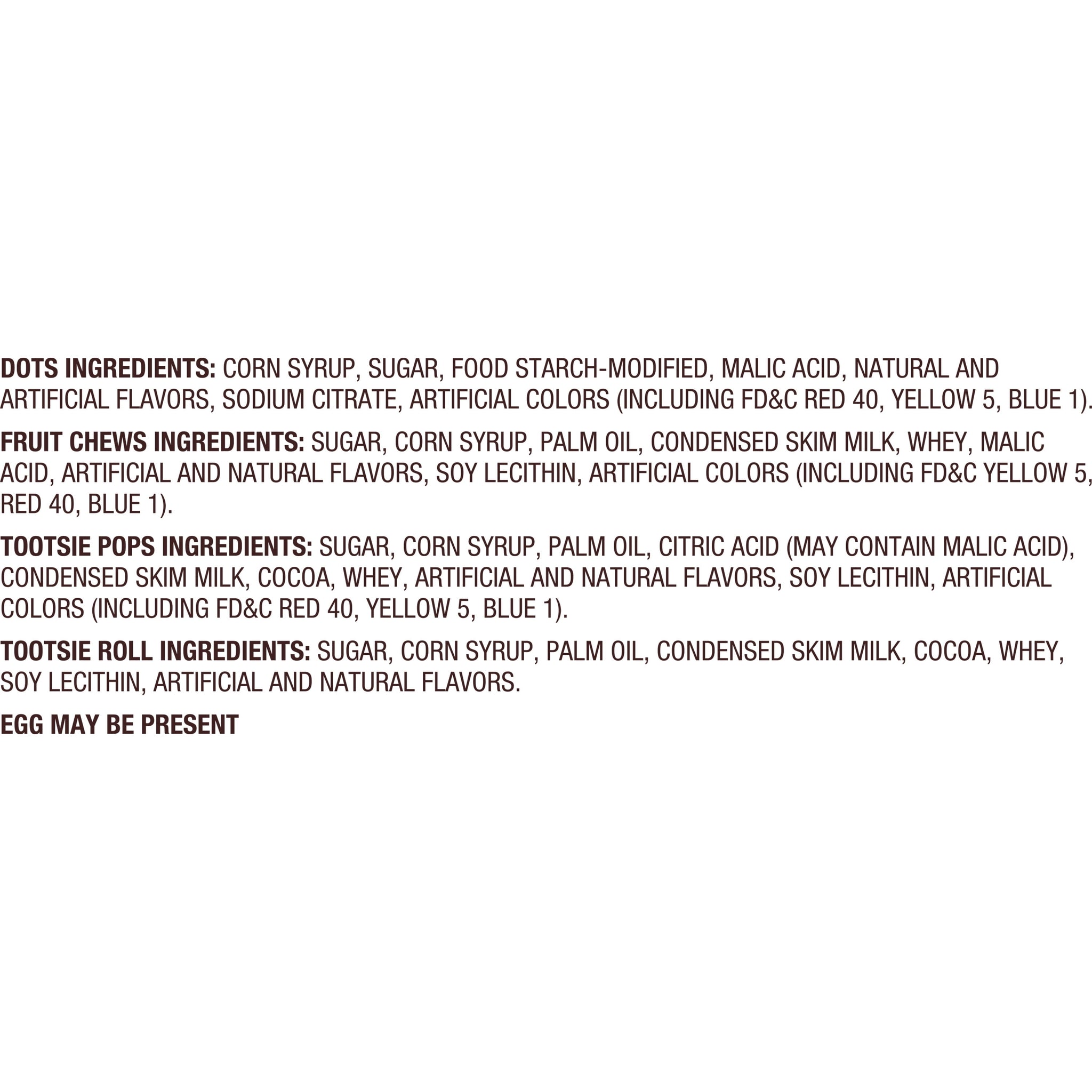 - Assortment of varying candy types and flavors with Tootsie Rolls, Tootsie Pops, Dots and Tootsie Fruit Chews