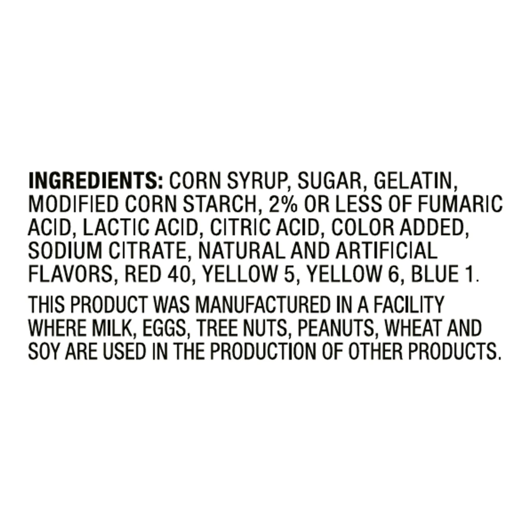 Corn Syrup, Sugar, Gelatin, Modified Food Starch (Corn), Fumaric Acid, Lactic Acid, Citric Acid, Sodium Citrate, Calcium Lactate, Sodium Lactate, Natural and Artificial Flavors, Titanium Dioxide [Color], Yellow 5, Red 40, Yellow 6, Blue 1./div>