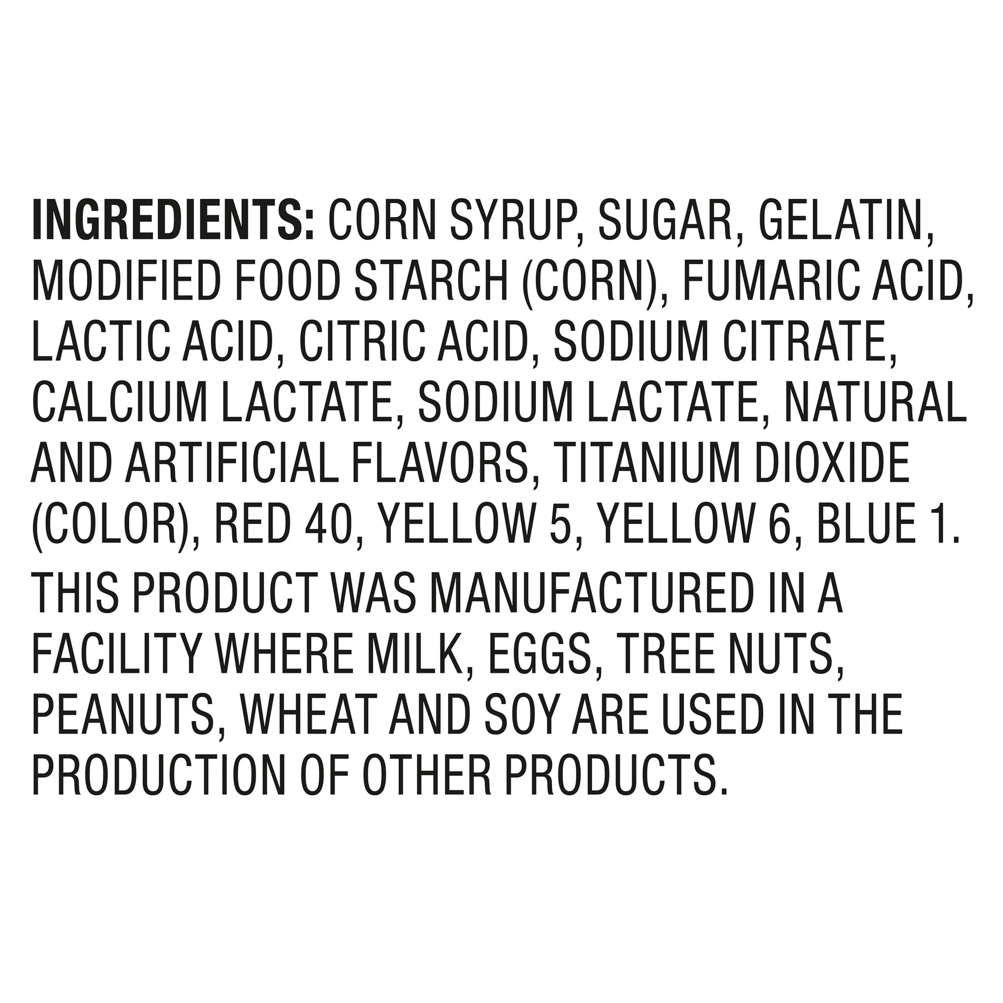 Corn Syrup, Sugar, Gelatin, Fumaric Acid, Lactic Acid, Citric Acid, Sodium Lactate, Calcium Lactate, Titanium Dioxide [Color], Natural And Artificial Flavors, Yellow 5, Red 40, Yellow 6, Blue 1. This Product Was Manufactured In A Facility Where Milk, Tree Nuts, Peanuts And Soy Are Used In The Production of Other Products./div>