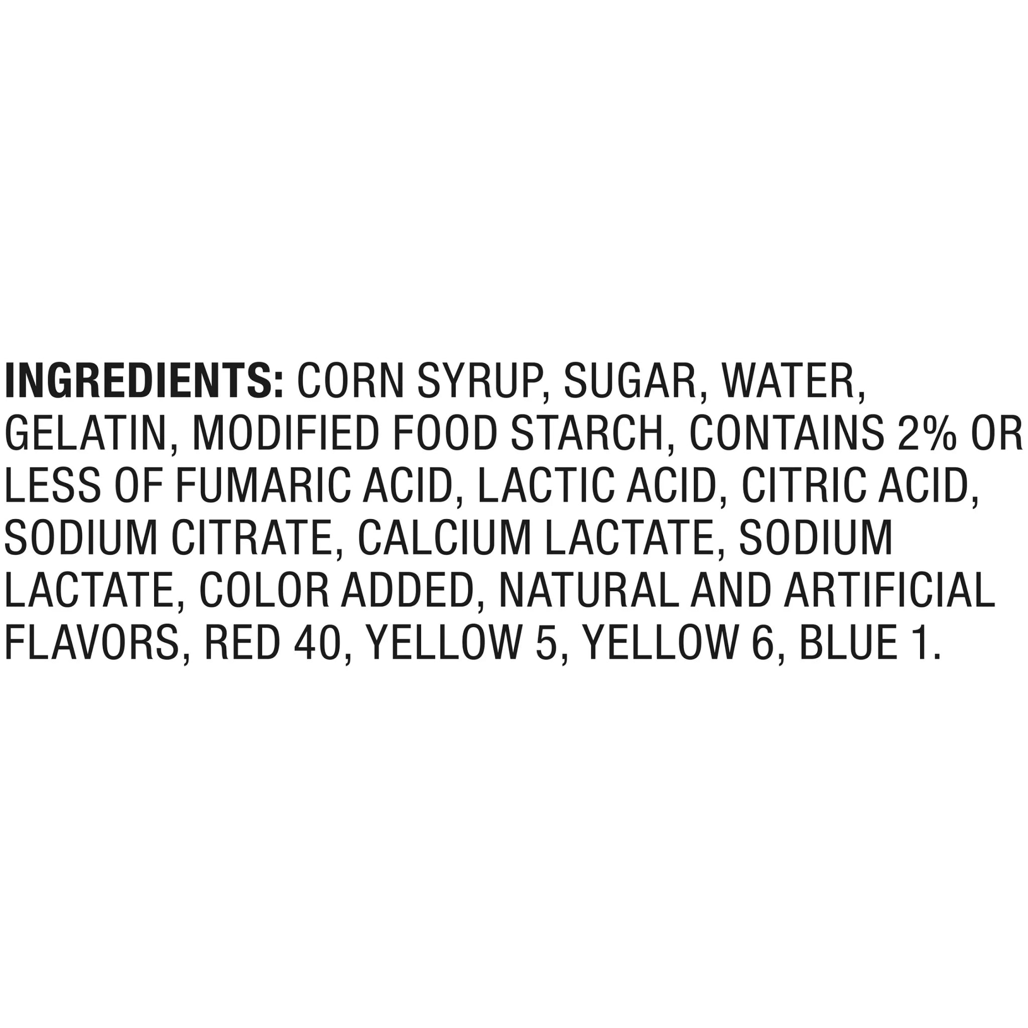 Corn Syrup, Sugar, Water, Gelatin, Modified Food Starch, Contains 2% or Less of Fumaric Acid, Lactic Acid, Citric Acid, Sodium Citrate, Calcium Lactate, Sodium Lactate, Color Added, Natural and Artificial Flavors, Red 40, Yellow 5, Yellow 6, Blue 1./div>