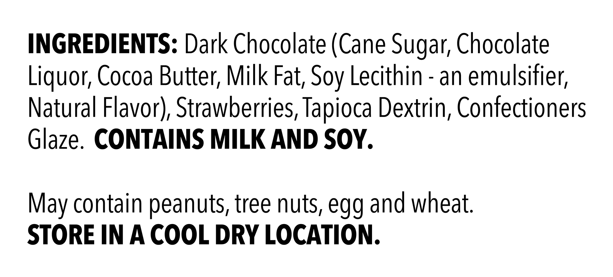 Dark Chocolate (Cane Sugar, Chocolate Liquor, Cocoa Butter, Milk Fat, Soy Lecithin - an emulsifier, Natural Flavor), Strawberries, Tapioca Dextrin, Confectioners Glaze. CONTAINS MILK AND SOY. May contain peanuts, tree nuts, egg and wheat. STORE IN A COOL DRY LOCATION./div>