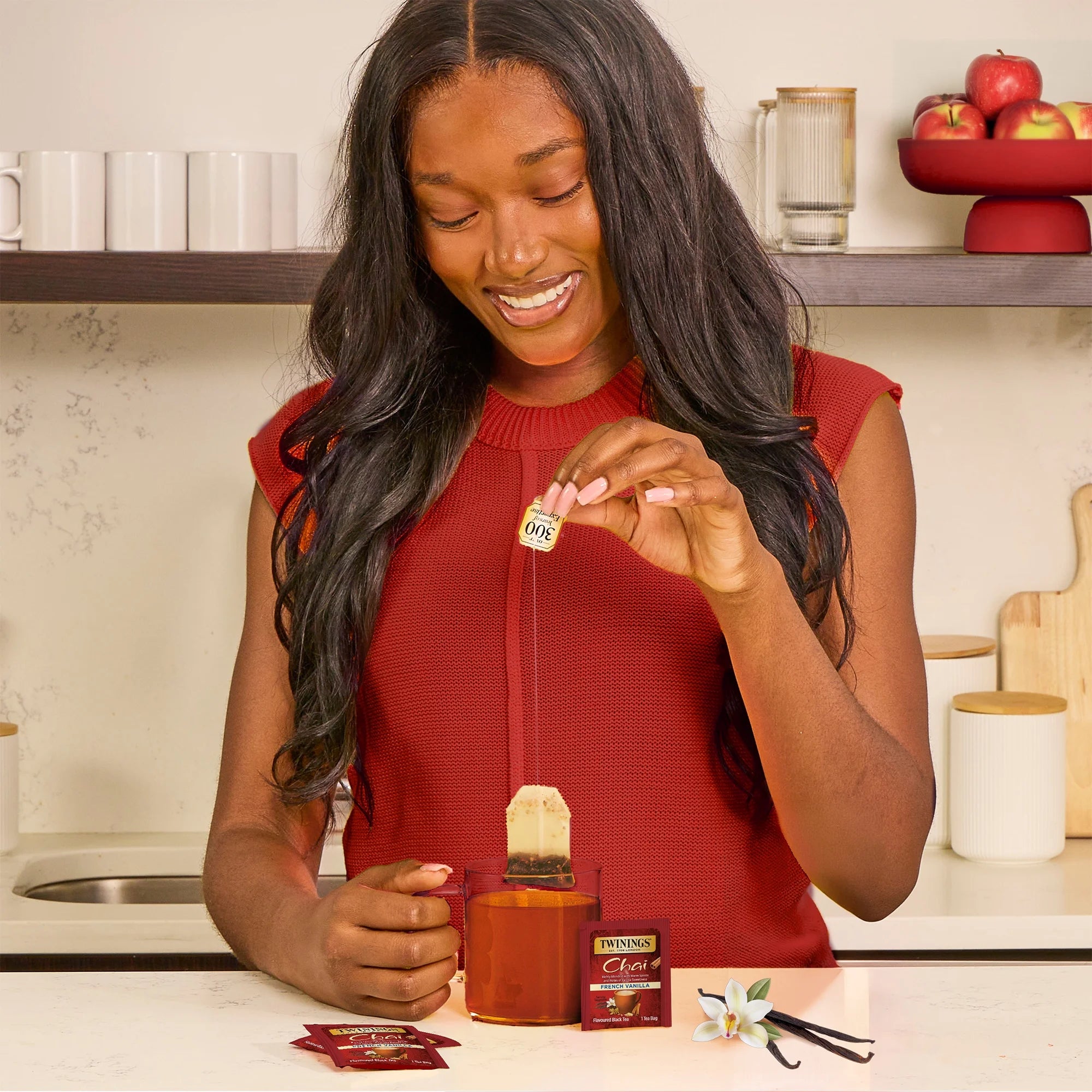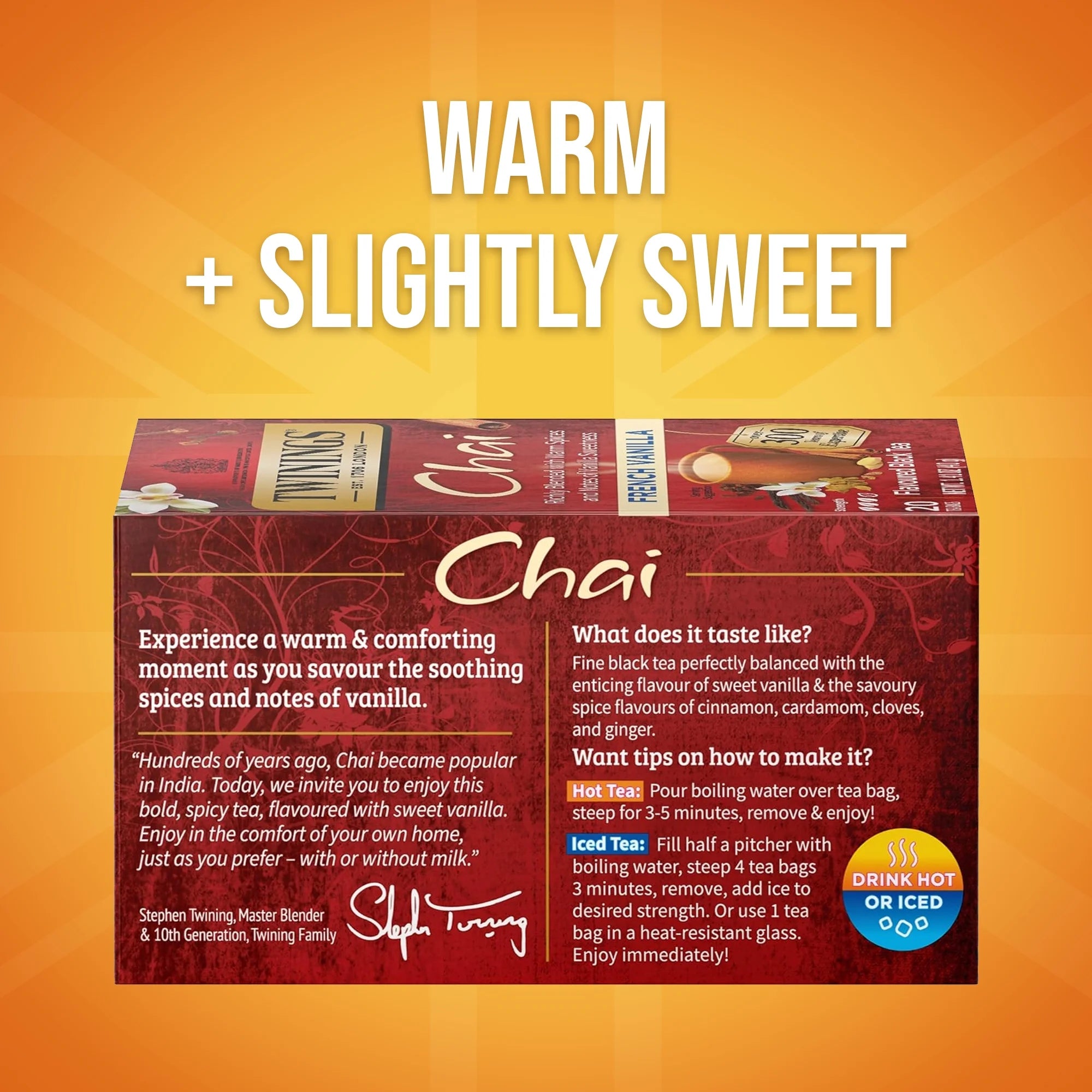 Twinings 20 Individually Wrapped Tea Bags, Chai French Vanilla Black Tea Blend with Sweet Vanilla, Cinnamon, Cardamom, Clove, and Ginger Flavours, Caffeinated This chai black tea blend features the finest black tea blended with the sweet and the savoury spice flavours of cinnamon, cardamom, cloves and ginger complimented with a hint of French vanilla to deliver a flavourful tea with a warm, soothing aroma and , spicy taste. To brew the perfect cup steep one bag for 5 minutes in boiling water. At Twinings, we believe in living well and enjoying life. Backed by generations of trusted knowledge and ethical integrity, our Master Blenders are committed to delivering nature’s goodness and ensuring consistent taste and quality by sourcing the world’s finest herbs, fruits, and teas. From traditional teas to functional blends, Twinings encourages consumers to “Drink in Life” by celebrating the small steps that make wellbeing attainable and remain committed to an optimistic life that is well-lived, one sip at a time.