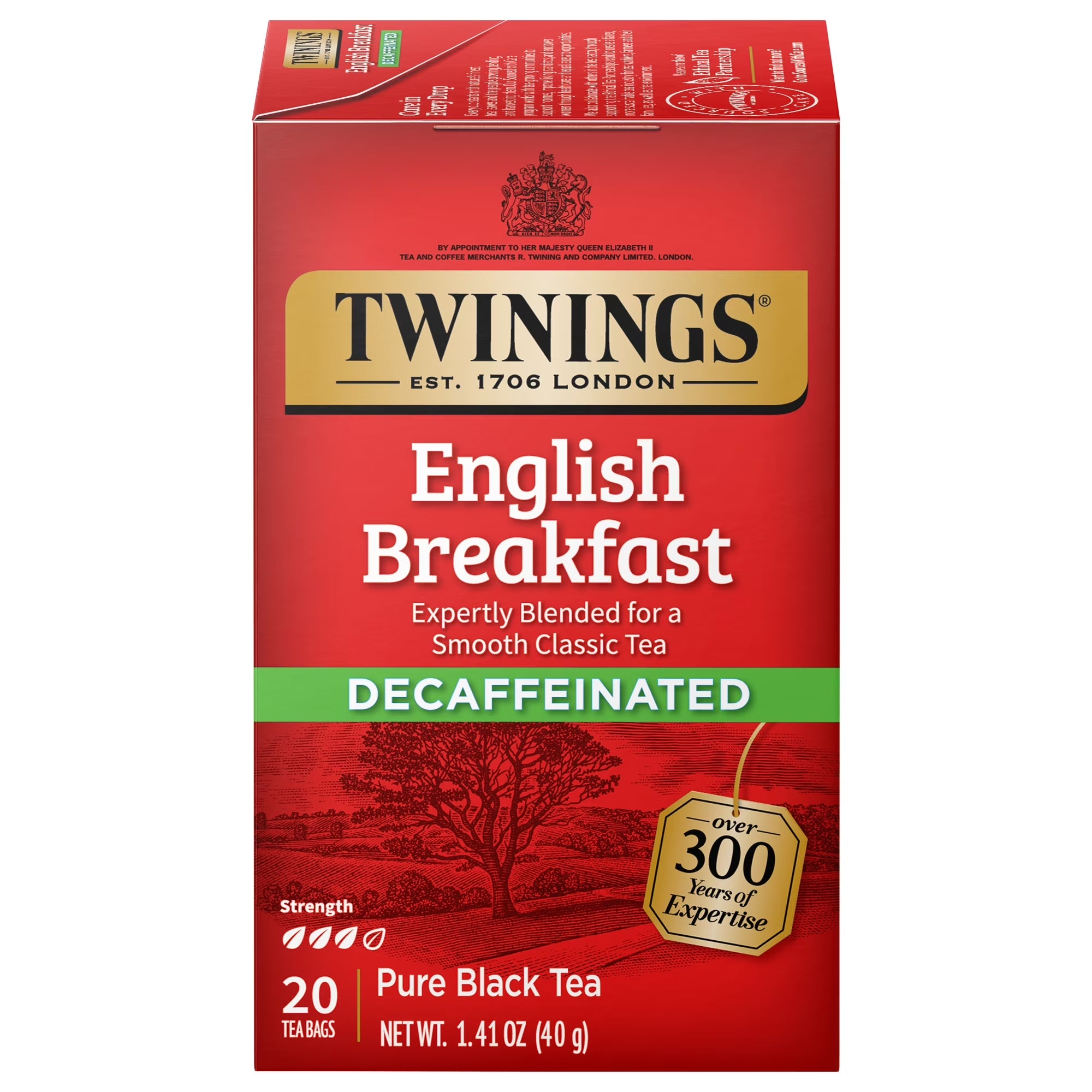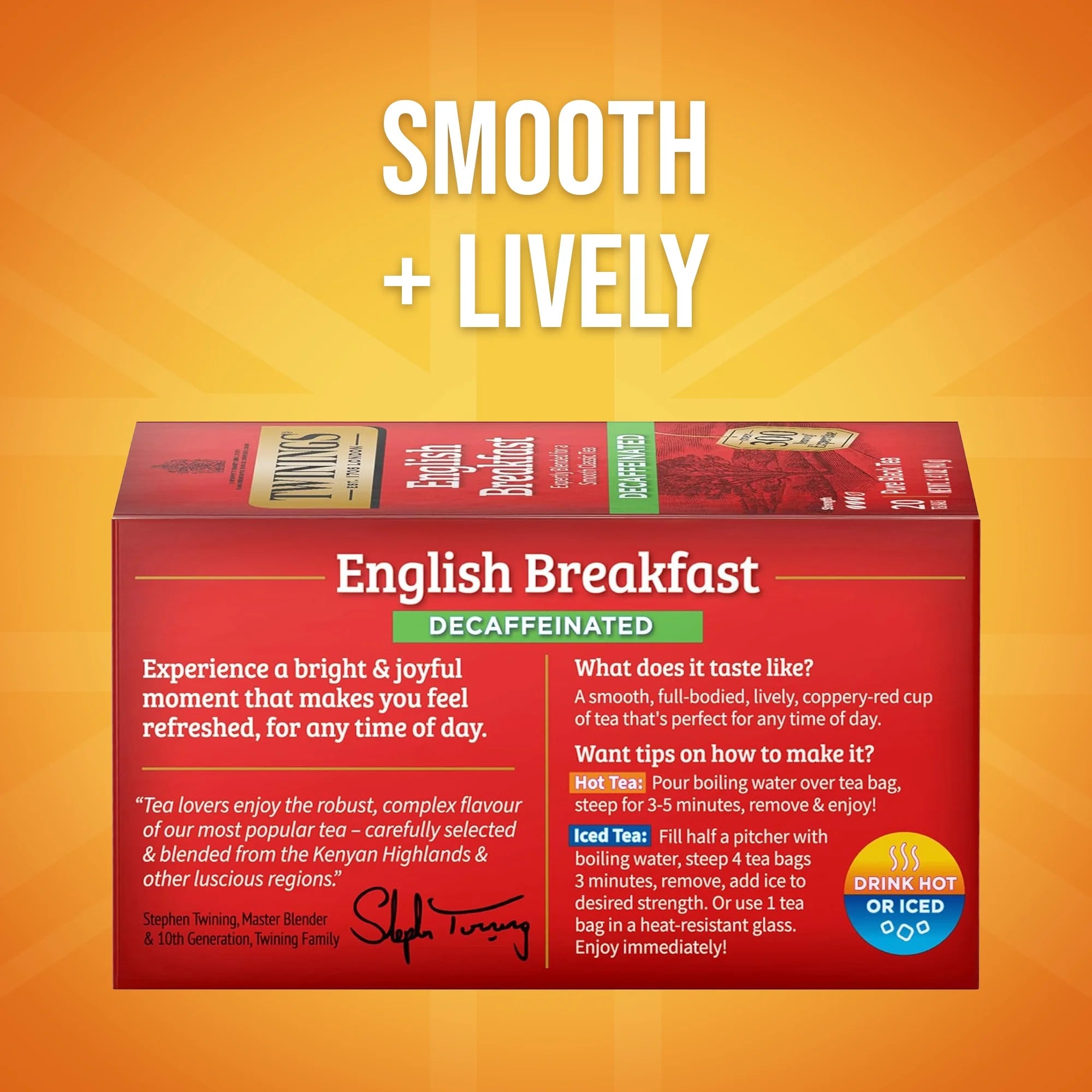 Twinings 20 Individually Wrapped Tea Bags, English Breakfast Black Tea Blend, Decaffeinated. English Breakfast is our most popular tea. The combination yields a complex, full-bodied, lively cup of tea that is perfect any time of day. To create this well-balanced blend, we select some of the finest teas, each with its own unique characteristics. Tea from Kenya and Malawi provides the briskness and coppery-red colour while Assam gives full-body and flavour. The robustness from these regions is complemented by softer teas from other regions. To brew the perfect cup, steep one tea bag for 5 minutes in boiling water. At Twinings, we believe in living well and enjoying life. Backed by generations of trusted knowledge and ethical integrity, our Master Blenders are committed to delivering nature’s goodness and ensuring consistent taste and quality by sourcing the world’s finest herbs, fruits, and teas. From traditional teas to functional blends, Twinings encourages consumers to “Drink in Life” by celebrating the small steps that make wellbeing attainable and remain committed to an optimistic life that is well-lived, one sip at a time.