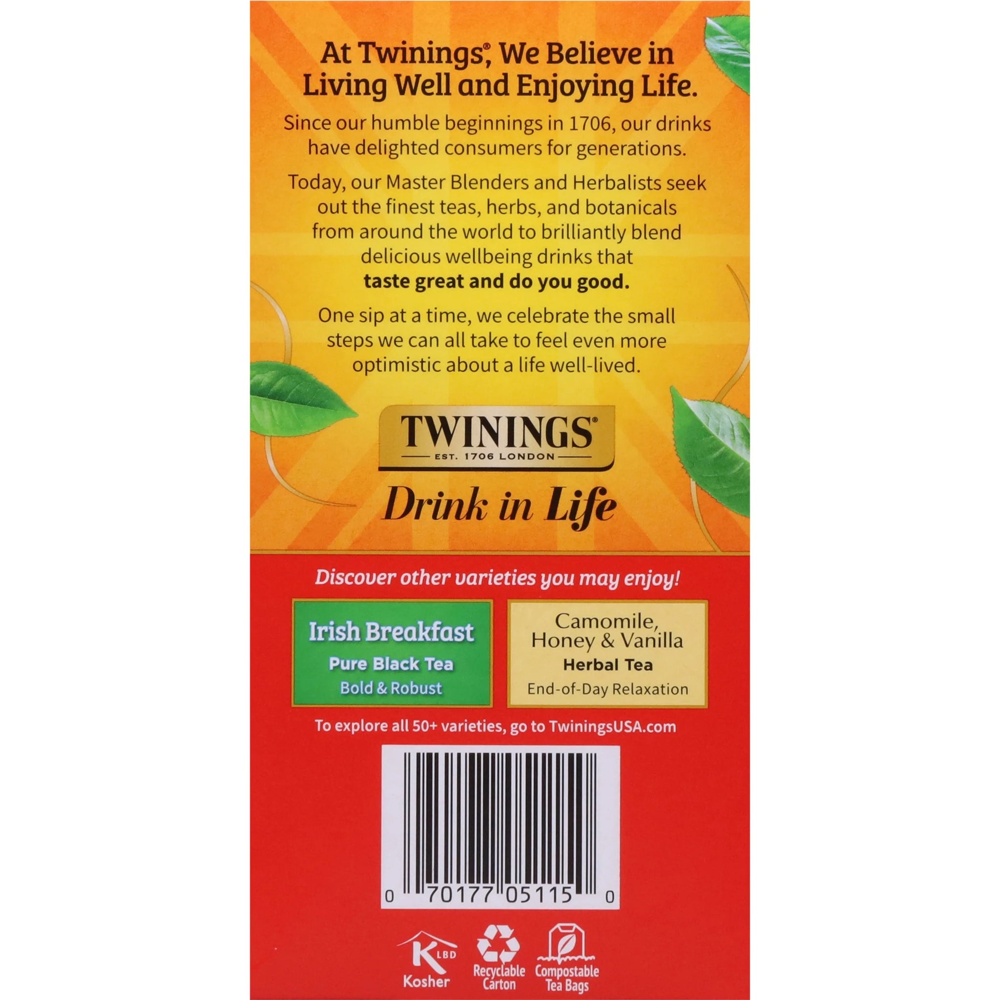 Twinings 50 Individually Wrapped Tea Bags, English Breakfast Black Tea Blend, Caffeinated English Breakfast is our most popular tea. The combination yields a complex, full-bodied, lively cup of tea that is perfect any time of day. To create this well-balanced blend, we select some of the finest teas, each with its own unique characteristics. Tea from Kenya and Malawi provides the briskness and coppery-red colour while Assam gives full-body and flavour. The robustness from these regions is complemented by softer teas from other regions. To brew the perfect cup, steep one tea bag for 5 minutes in boiling water. At Twinings, we believe in living well and enjoying life. Backed by generations of trusted knowledge and ethical integrity, our Master Blenders are committed to delivering nature’s goodness and ensuring consistent taste and quality by sourcing the world’s finest herbs, fruits, and teas. From traditional teas to functional blends, Twinings encourages consumers to “Drink in Life” by celebrating the small steps that make wellbeing attainable and remain committed to an optimistic life that is well-lived, one sip at a time.