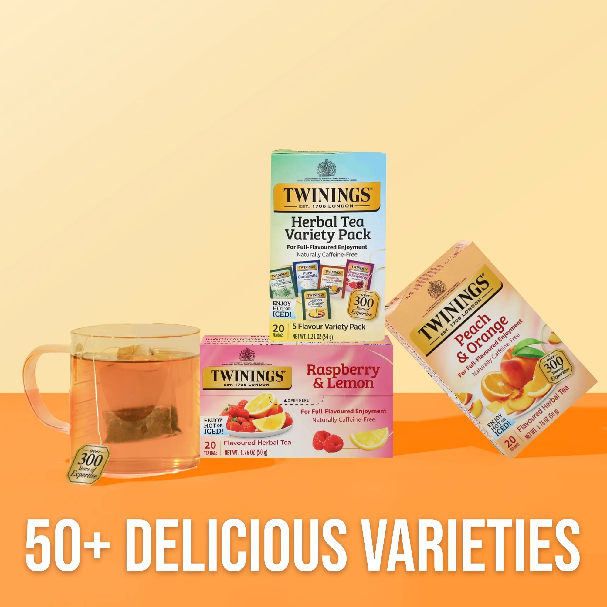 Twinings 20 Individually Wrapped Tea Bags 4 Flavour Herbal Variety Pack, Juicy Pomegranate and Raspberry Blend, Orange and Cinnamon Spice, Pure Camomile, and Nightly Calm Herbal Blend with Soothing Camomile, Spearmint, and Lemongrass Flavours, Naturally Caffiene Free The Twinings Assorted Herbal Tea Bags includes four tea blends, Raspberry & Pomegranate, Nightly Calm, Orange & Cinnamon Spice and Pure Camomile (or Chamomile). To brew the perfect cup, steep one tea bag for 5 minutes in boiling water. Herbs have a long history of documented use tracing back to Ancient Egypt, Ancient and to the beginning of Ayurveda science in India. Herbal teas can be made from any combination of flowers, leaves, seeds, roots, citrus or berry fruits herbs and spices-which is why the number of unique blends is virtually limitless. At Twinings, we believe in living well and enjoying life. Backed by generations of trusted knowledge and ethical integrity, our Master Blenders are committed to delivering nature’s goodness and ensuring consistent taste and quality by sourcing the world’s finest herbs, fruits, and teas. From traditional teas to functional blends, Twinings encourages consumers to “Drink in Life” by celebrating the small steps that make wellbeing attainable and remain committed to an optimistic life that is well-lived, one sip at a time.