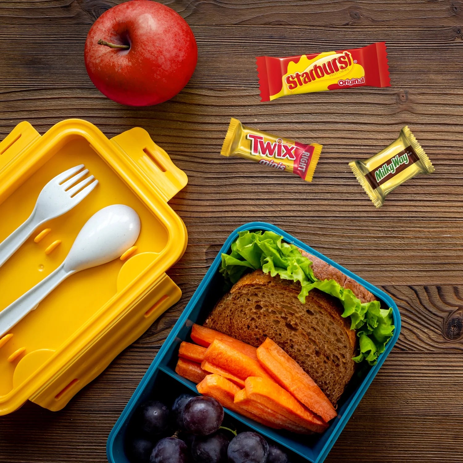 - Contains one (1) 21.82-ounce party size bulk candy bag of TWIX, MILKY WAY, STARBURST & SKITTLES Fun Size and Mini Candy Variety Pack