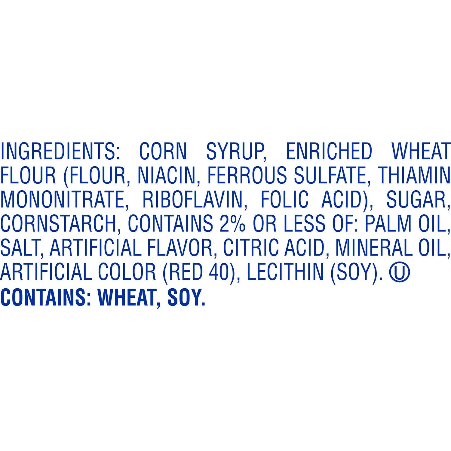 CORN SYRUP, ENRICHED WHEAT FLOUR (FLOUR, NIACIN, FERROUS SULFATE, THIAMIN MONONITRATE, RIBOFLAVIN, FOLIC ACID), SUGAR, CORNSTARCH, CONTAINS 2% OR LESS OF: PALM OIL, SALT, ARTIFICIAL FLAVOR, CITRIC ACID, MINERAL OIL, ARTIFICIAL COLOR (RED 40), LECITHIN (SOY)./div>