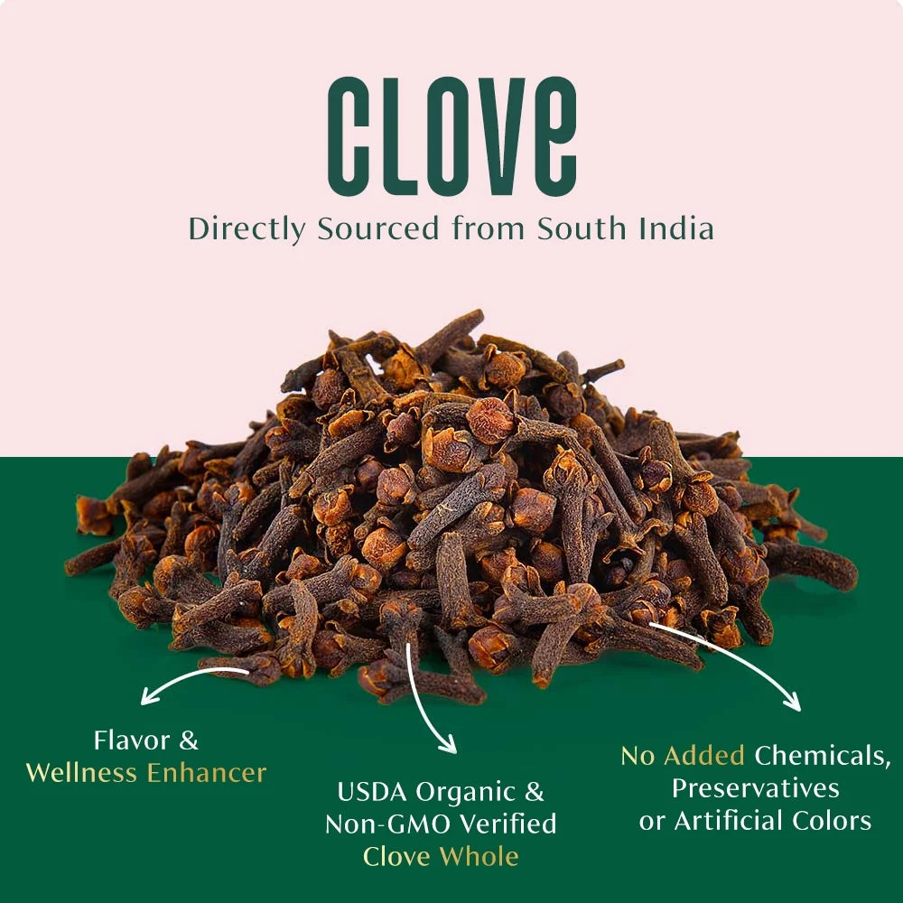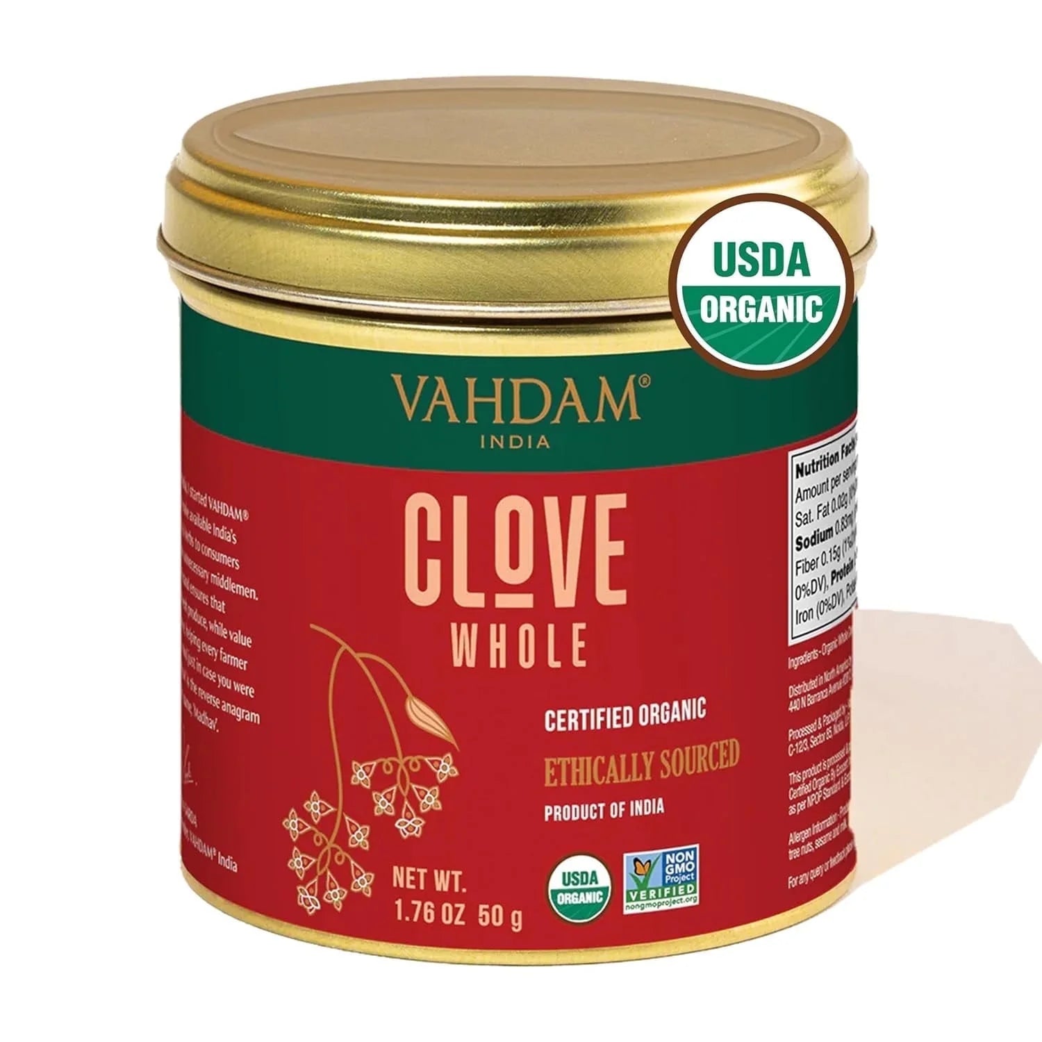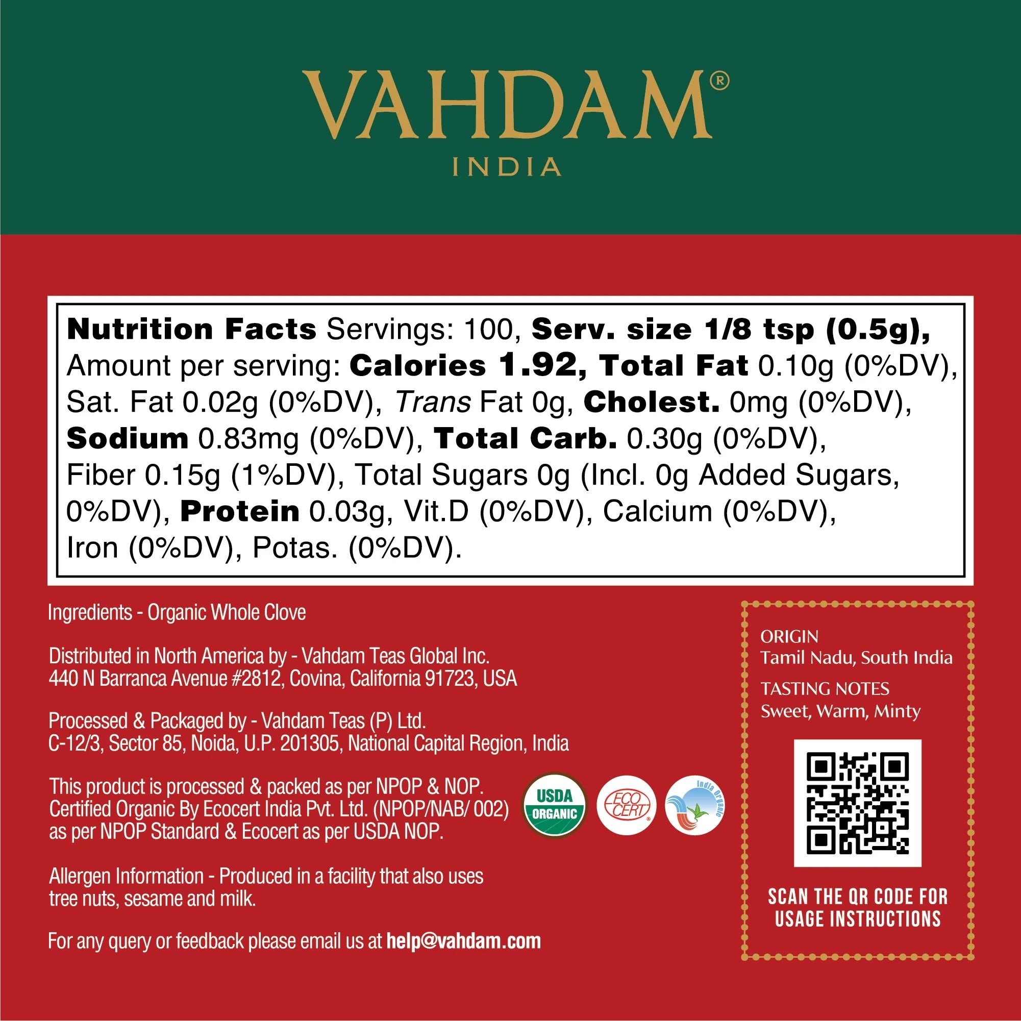 Discover the rich, aromatic essence of VAHDAM's Organic Clove Whole, sourced directly from Rajasthan, India. These versatile clove buds are a must-have for your culinary adventures, enhancing the flavor of soups, stews, teas, and desserts with their warm, pungent aroma and savory taste. Certified USDA Organic and Non-GMO, these cloves are free from chemicals and preservatives, ensuring maximum freshness and purity in every batch. As a carbon-neutral and plastic-neutral , VAHDAM is committed to ethical sourcing and supporting social initiatives like the TEAch Me program, which allocates 1% of revenue to education. Enjoy the authentic, high-quality flavor of these premium cloves, packaged in a convenient tin caddy for optimal freshness.