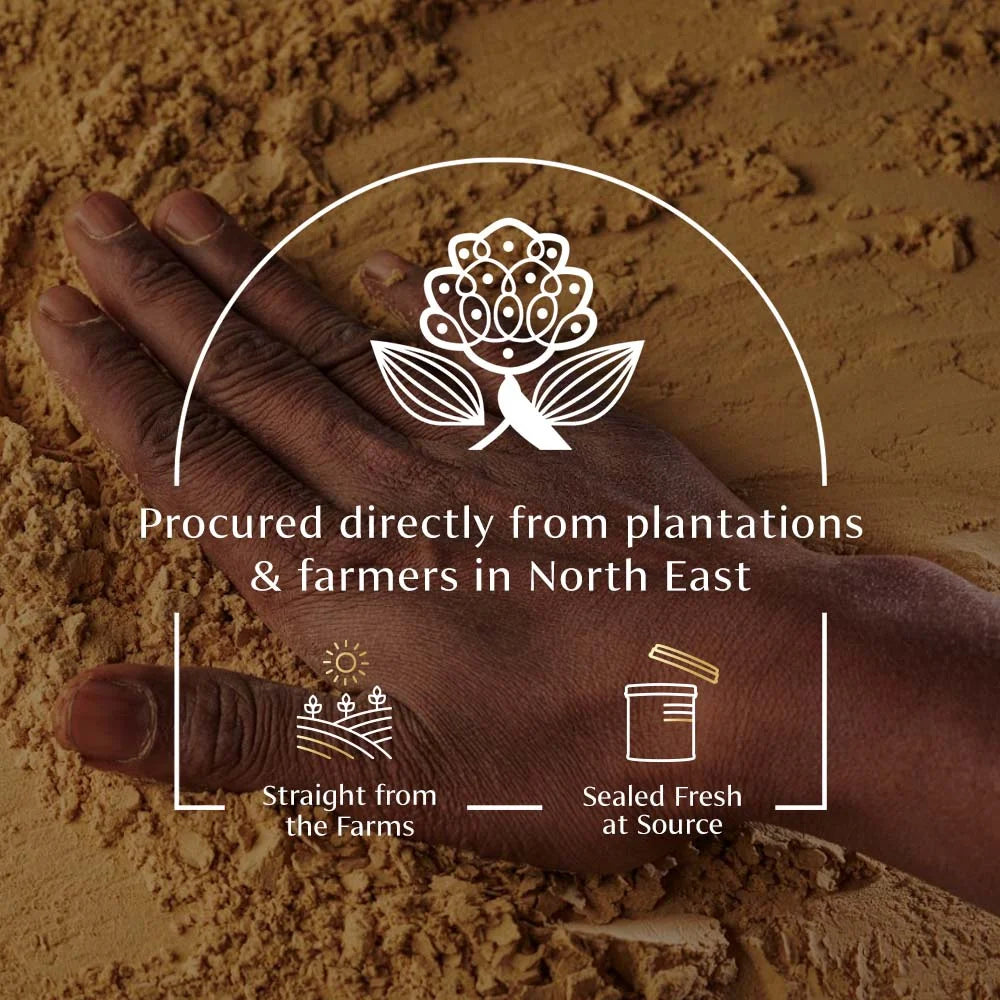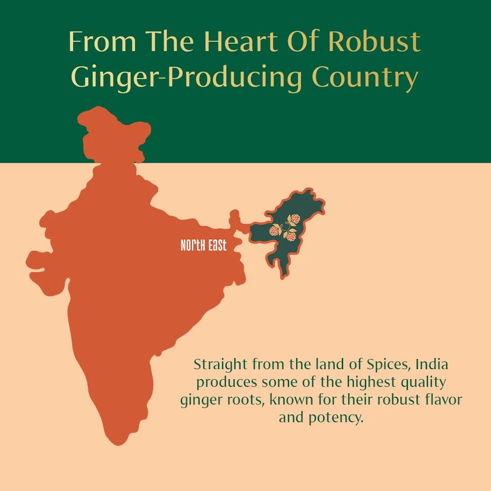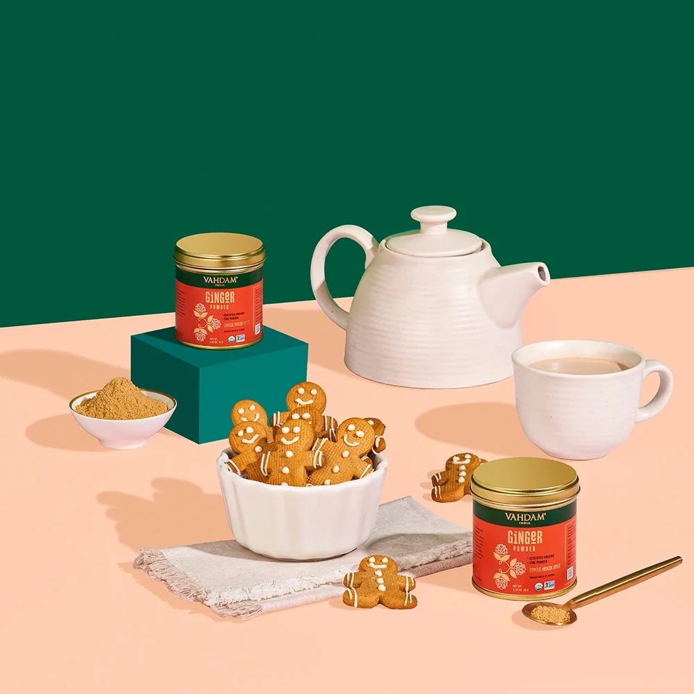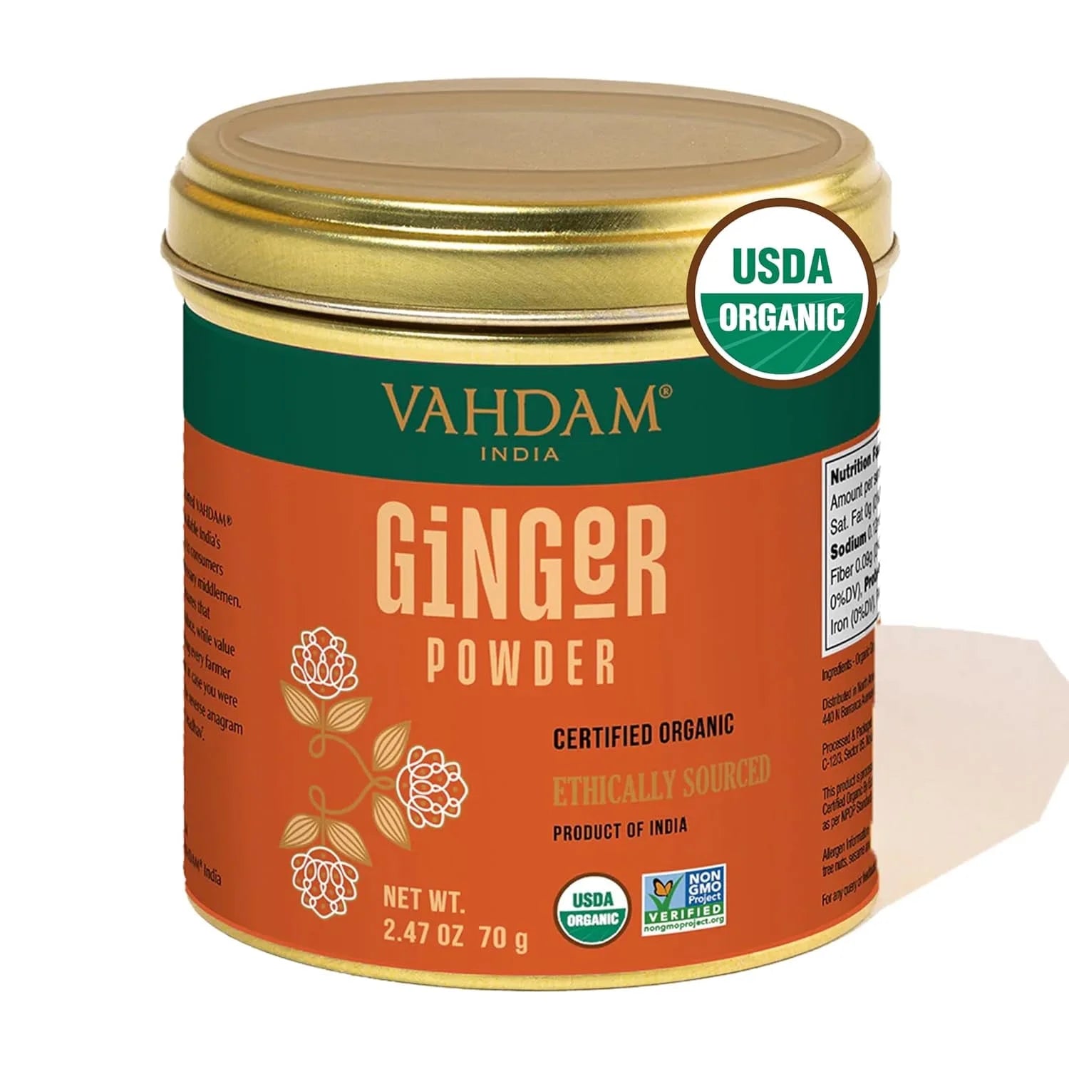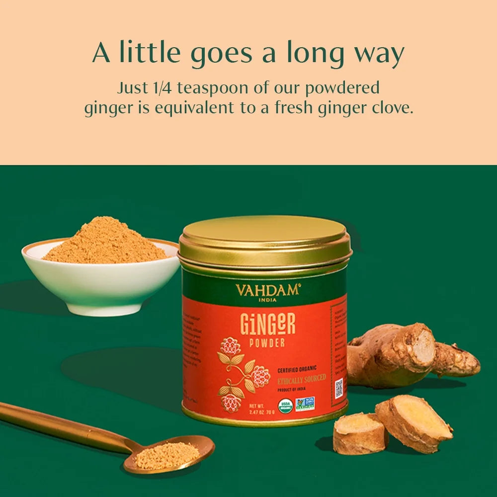 VAHDAM India Ginger Powder, is made from the freshest rhizomes, sourced directly from North East India. This premium ginger powder boasts a pungent, citrusy, and spicy flavor profile, making it a popular ingredient in Indian and South Asian cuisine. Its unique fragrance and flavor come from oils like Gingerol, which add both nutrition and taste to your dishes, smoothies, lattes, tea, and more. Packaged in premium tin caddies, our powder is USDA Organic and NON-GMO Certified, ensuring it is free from chemicals and additives and is ethically sourced and procured directly at the source, ensuring freshness. VAHDAM India, a carbon-neutral and plastic-neutral , delivers to over 130 countries and is known for disrupting the age-old tea supply chain. Committed to fair-trade practices and social initiatives like TEAch Me, which dedicates 1% of revenue for education, VAHDAM India ensures every purchase makes a positive impact.