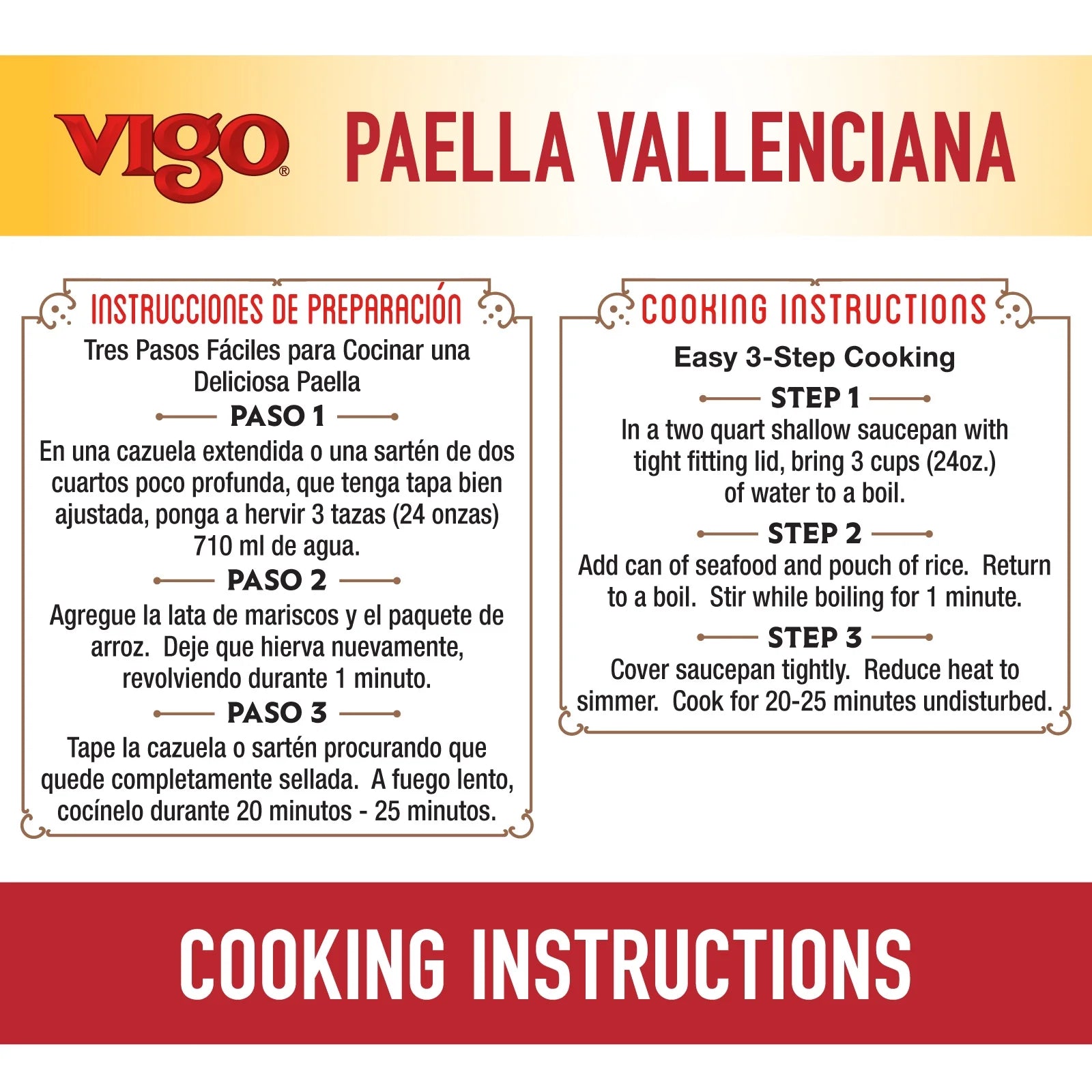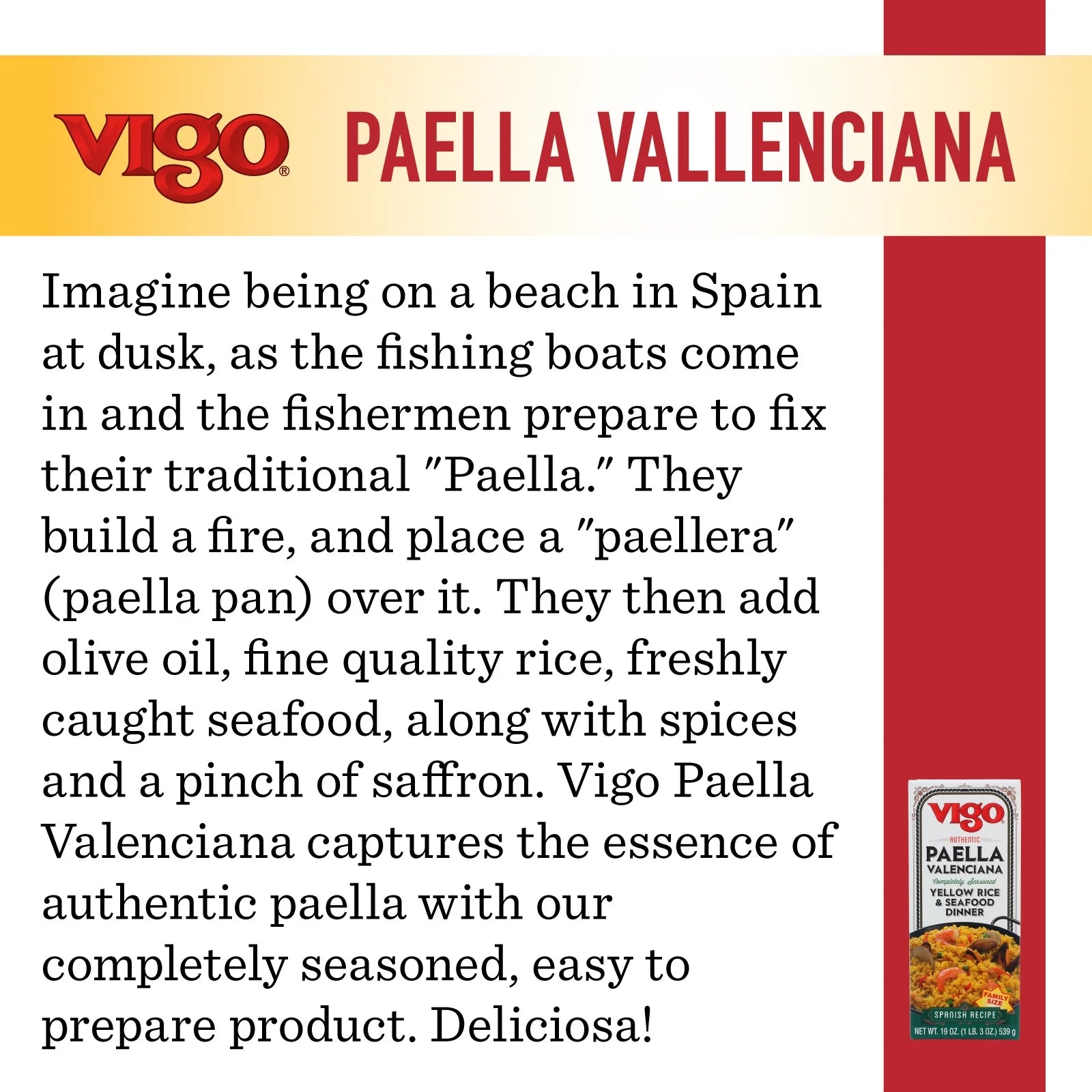 Imagine being on a beach in Spain at dusk, as the fishing boats come in and the fishermen prepare to fix their traditional "Paella." They build a fire, and place a paella pan over it. They then add olive oil, fine quality rice, freshly caught seafood, along with spices and a pinch of saffron. Vigo Paella Valencia captures the essence of authentic paella with our completely seasoned, easy to prepare product. Delicious!