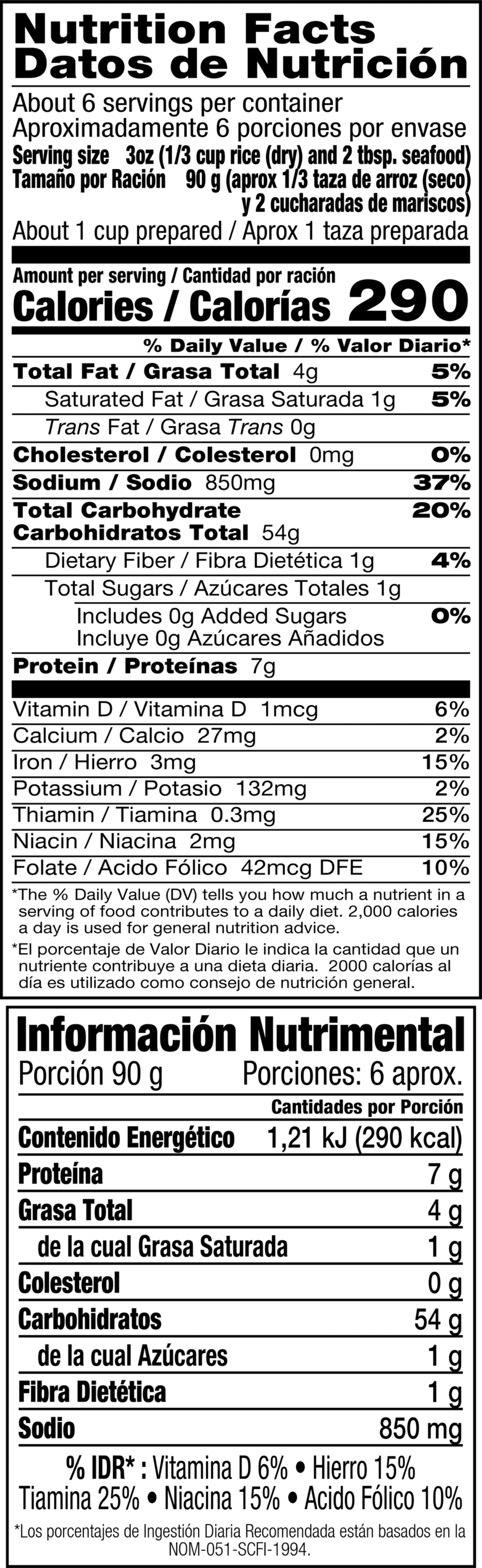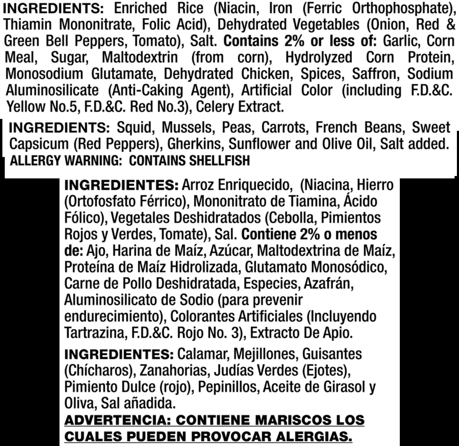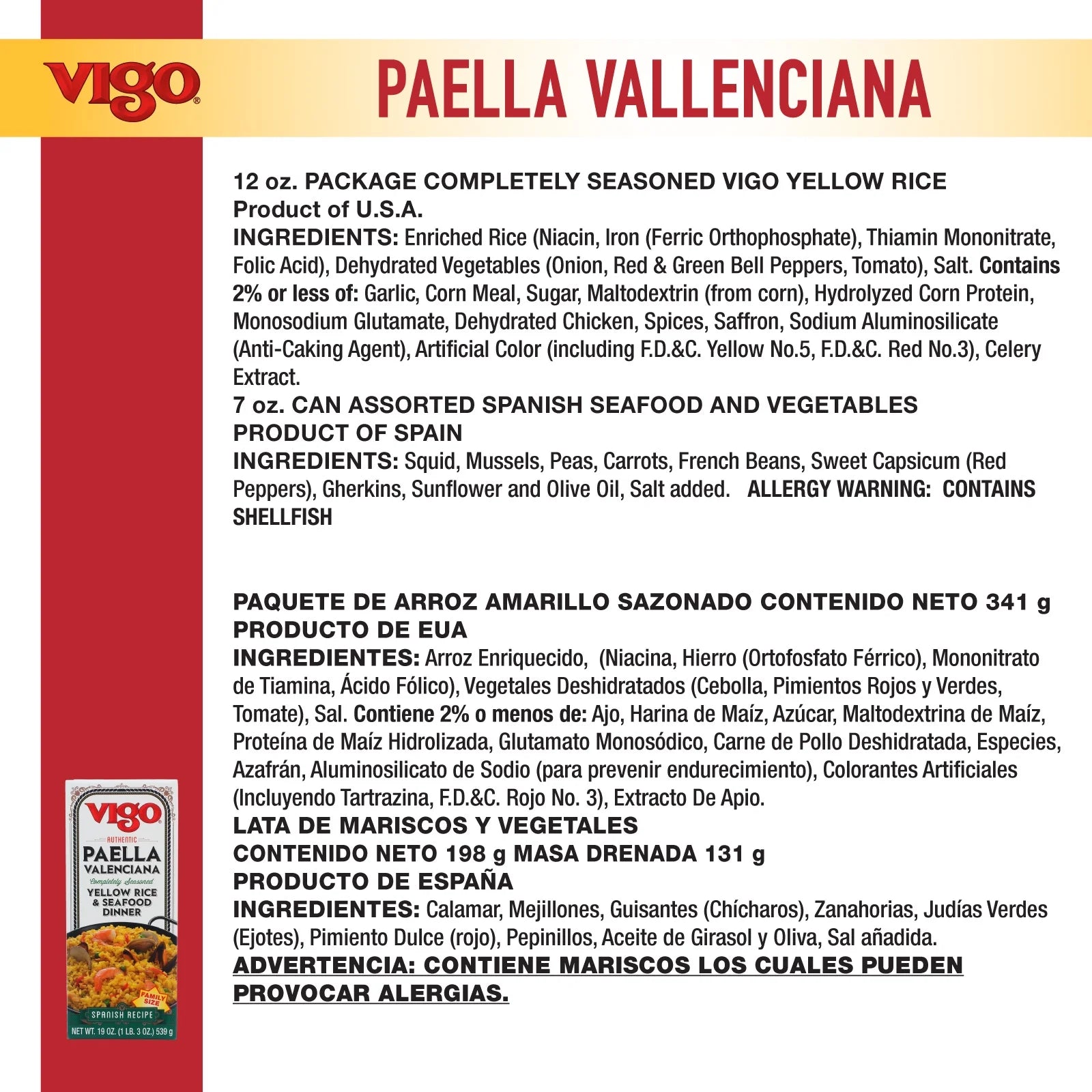12oz. Package completely seasoned vigo yellow rice. Enriched Rice (Niacin, Iron (Ferric Orthophosphate), Thiamin Mononitrate, Folic Acid), Dehydrated Vegetables (Onion, Red & Green Bell Peppers, Tomato), Salt. Contains 2% or less of: Garlic, Corn Meal, Sugar, Maltodextrin (from Corn), Hydrolyzed Corn Protein, Monosodium Glutamate, Dehydrated Chicken, Spices, Saffron, Sodium Aluminosilicate (Anti-Caking Agent), Artificial Color (Including F.D&C. Yellow No. 5, F.D.&C. Red No. 3), Celery Extract.7oz. Can assorted Spanish seafood and vegetables. Squid, Mussels, Peas, Carrots, French Beans, Sweet Capsicum (Red Pepper), Gherkins, Soya and Olive Oil, Salt Added./div>