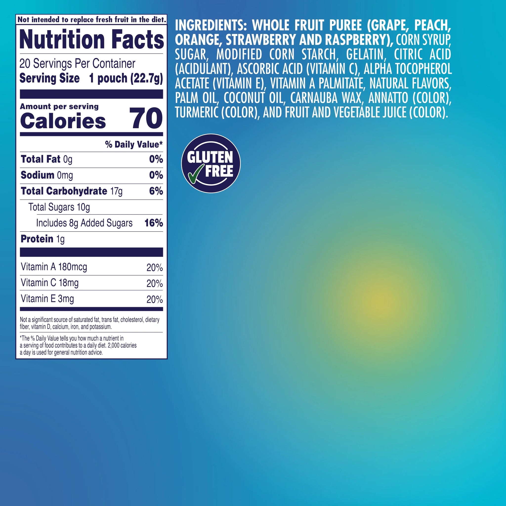 Fruit Puree (Grape, Peach, Orange, Strawberry and Raspberry), Corn Syrup, Sugar, Modified Corn Starch, Gelatin, Citric Acid (Acidulant) Ascorbic Acid (Vitamin C), Alpha Tocopherol Acetate (Vitamin E), Vitamin A Palmitate, Sodium Citrate, Natural Flavors, Palm Oil, Coconut Oil, Carnauba Wax, Annatto (Color), Turmeric (Color), and Fruit and Vegetable Juice (Color)./div>