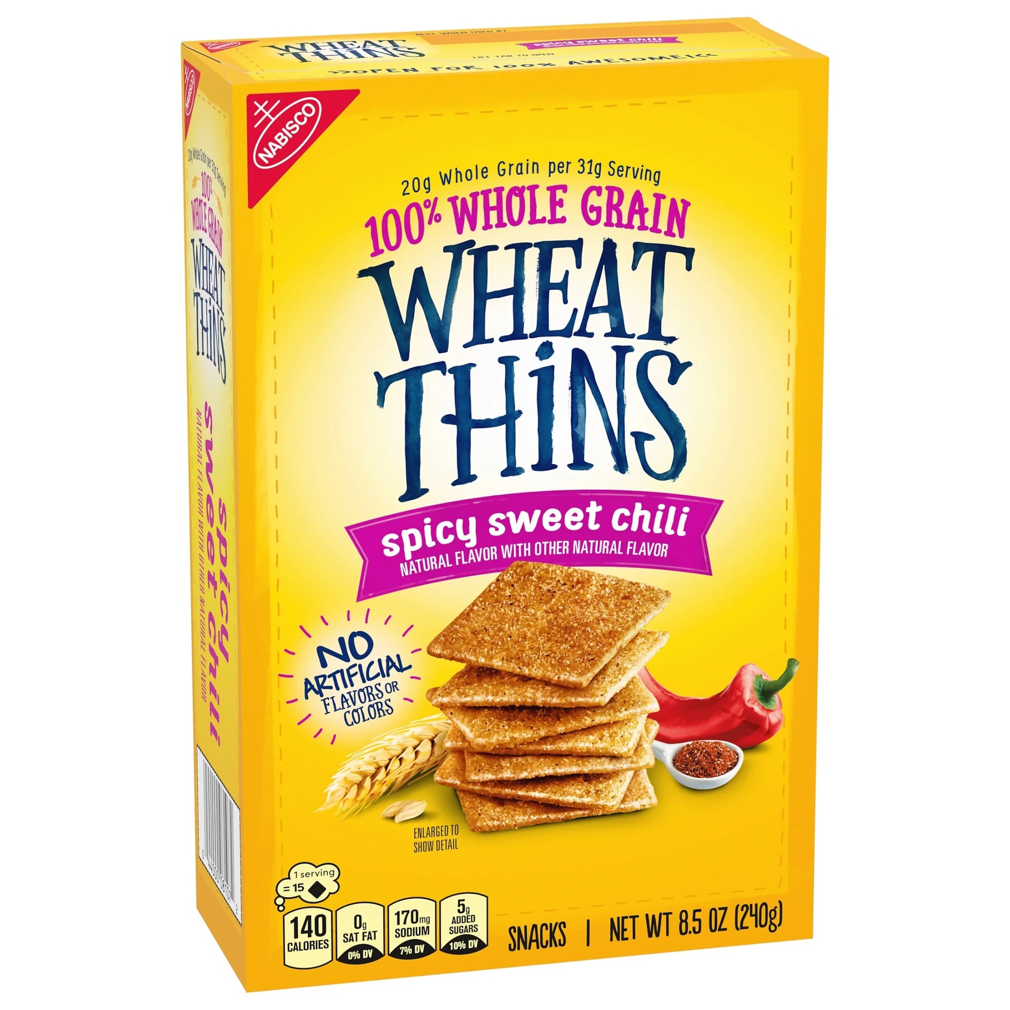 Upgrade your snacks with Wheat Thins Spicy Sweet Chili Snacks, Whole Grain Wheat Crackers. Made with 100% whole grain wheat, these savory snacks have a spicy-sweet chili whole grain flavor that makes these snack crackers a great companion to dips, spreads, and toppings. With a spicy-sweet taste and a crunchy texture, these crispy, thin crackers also contain no artificial flavors and colors. These baked crackers are wonderful whole grain snacks for adults and take cheese and crackers to the next level. Elevate party snacks by adding these whole grain crackers to a cheese tray or charcuterie board.