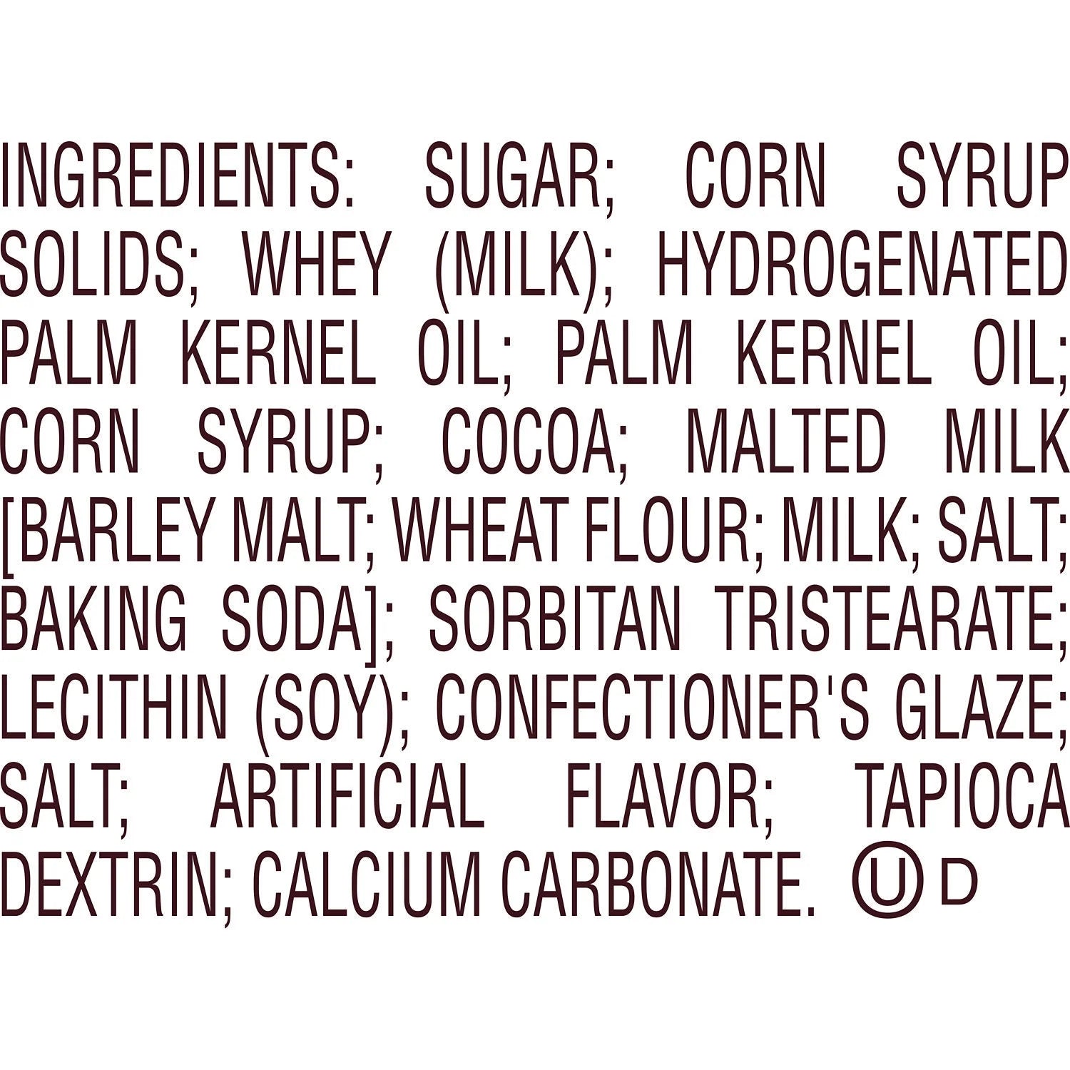 SUGAR, CORN SYRUP SOLIDS, WHEY (MILK), HYDROGENATED PALM KERNEL OIL, PALM KERNEL OIL, COCOA, CONTAINS 2% OR LESS OF: MALTED MILK (BARLEY MALT, WHEAT FLOUR, MILK, SALT, BAKING SODA), CORN SYRUP, CONFECTIONER'S GLAZE, SORBITAN TRISTEARATE, LECITHIN (SOY), SALT, ARTIFICIAL FLAVOR, TAPIOCA DEXTRIN, CALCIUM CARBONATE./div>