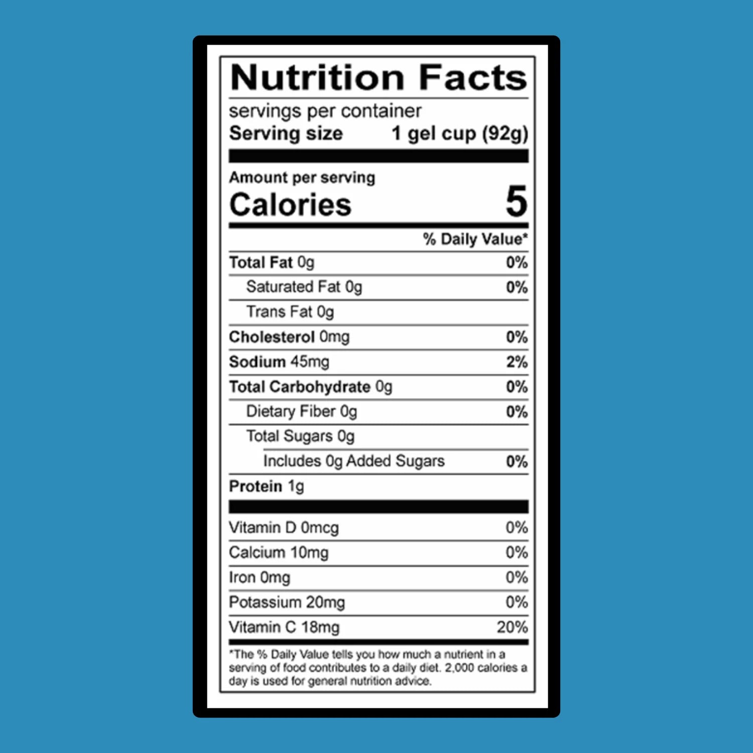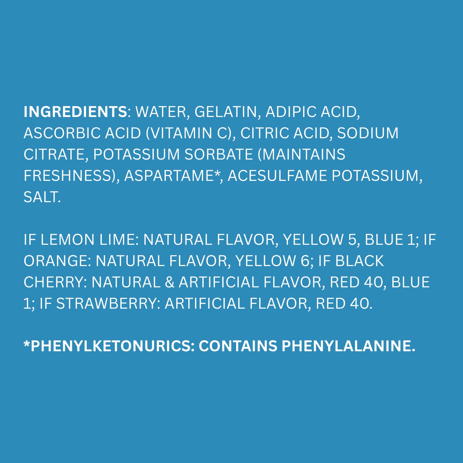 Water, Gelatin, Adipic Acid, Ascorbic Acid (Vitamin C), Citric Acid, Sodium Citrate, Potassium Sorbate (Maintains Freshness), Aspartame*, Acesulfame Potassium, Salt. If Lemon Lime: Natural Flavor, Yellow 5, Blue 1; If Orange: Natural Flavor, Yellow 6; If Black Cherry: Natural & Artificial Flavor, Red 40, Blue 1; If Strawberry: Artificial Flavor, Red 40. *Phenylketonurics: Contains Phenylalanine./div>