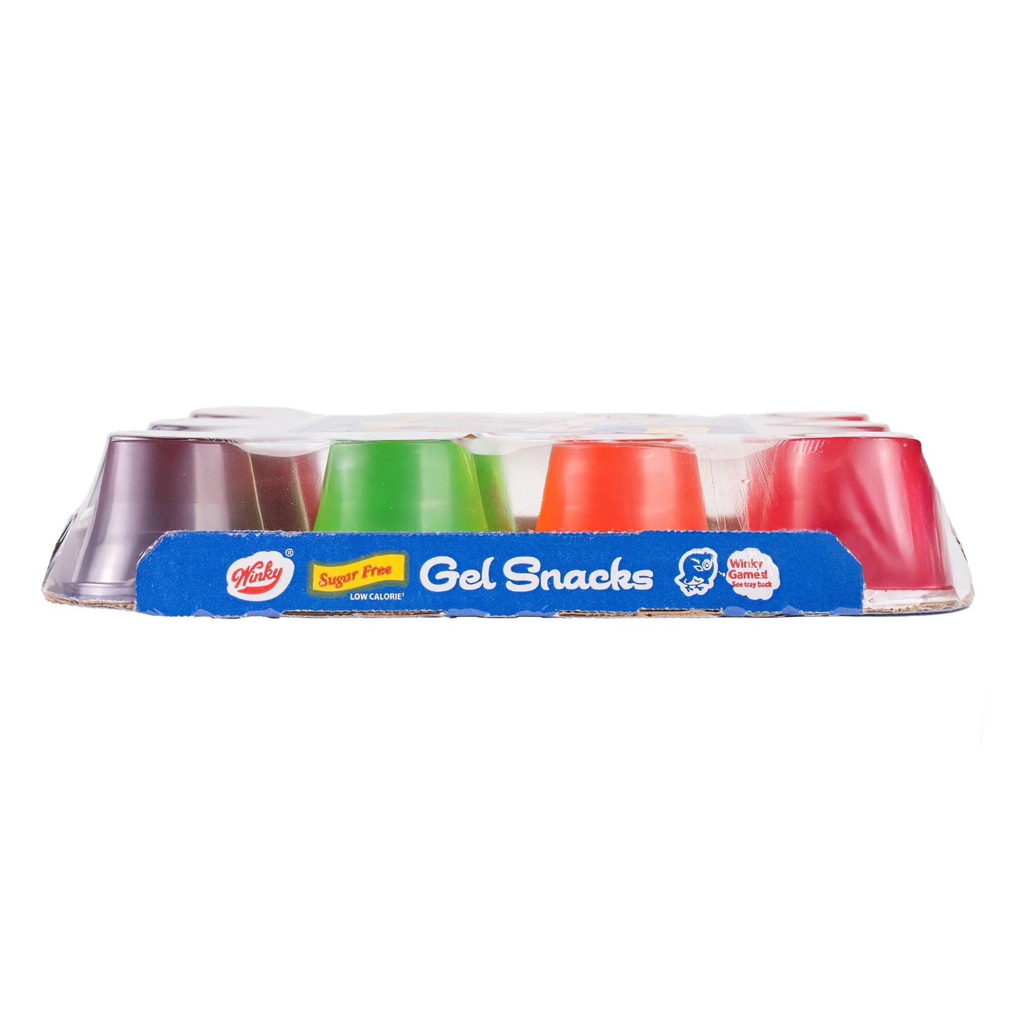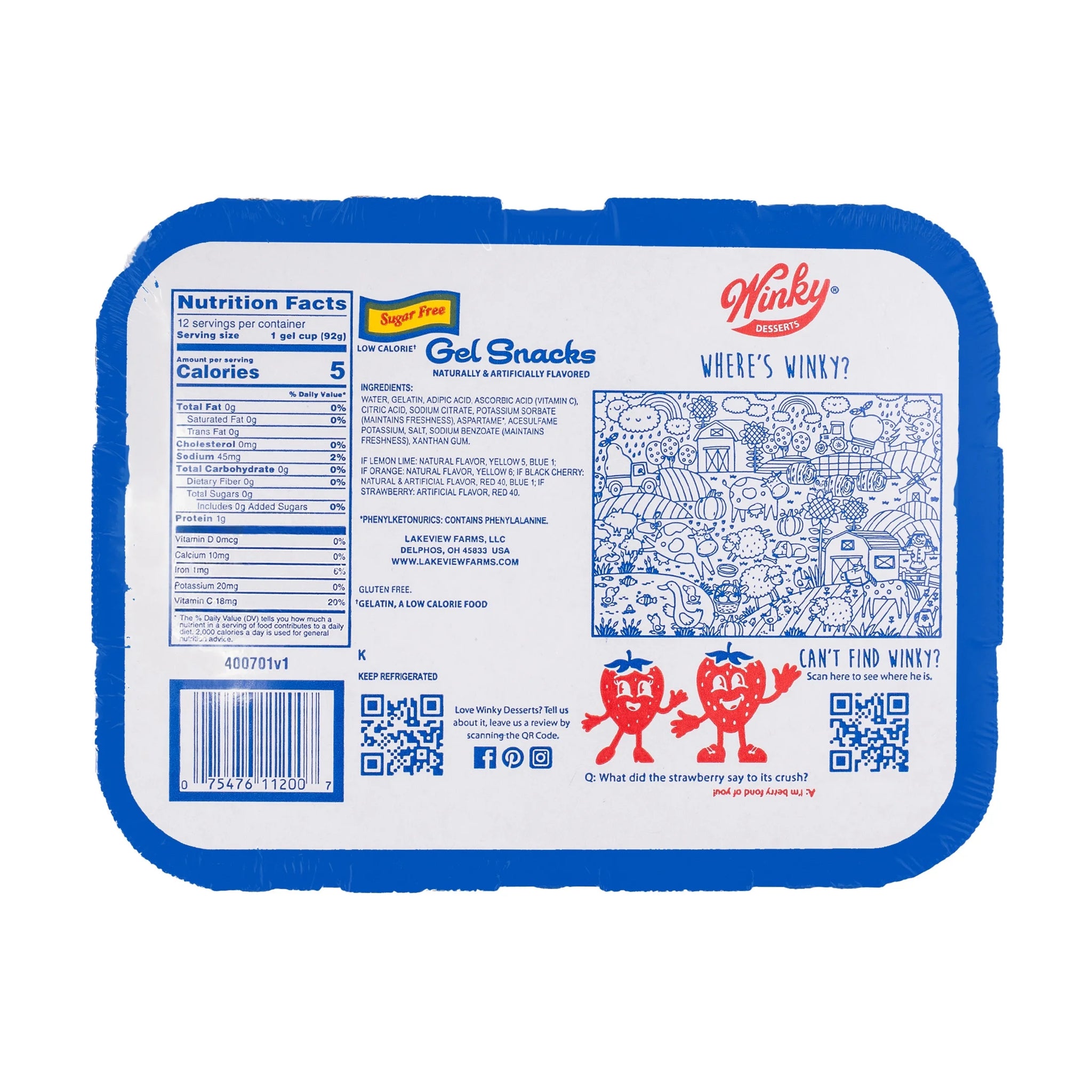 All Winky Gelatin desserts are low in sodium. A flavorful assortment of lemon lime, orange, black cherry, and strawberry. These sugar free gelatin cups are only 5 calories per cup which make it the perfect guilt free treat. They are quick, fun, easy-to-eat desserts that are great for lunches, snacktime or just about anywhere. 12 Count Plastic Cups found in refrigerated dessert section. Contains Artificial Flavor. Soft texture. Gluten-Free