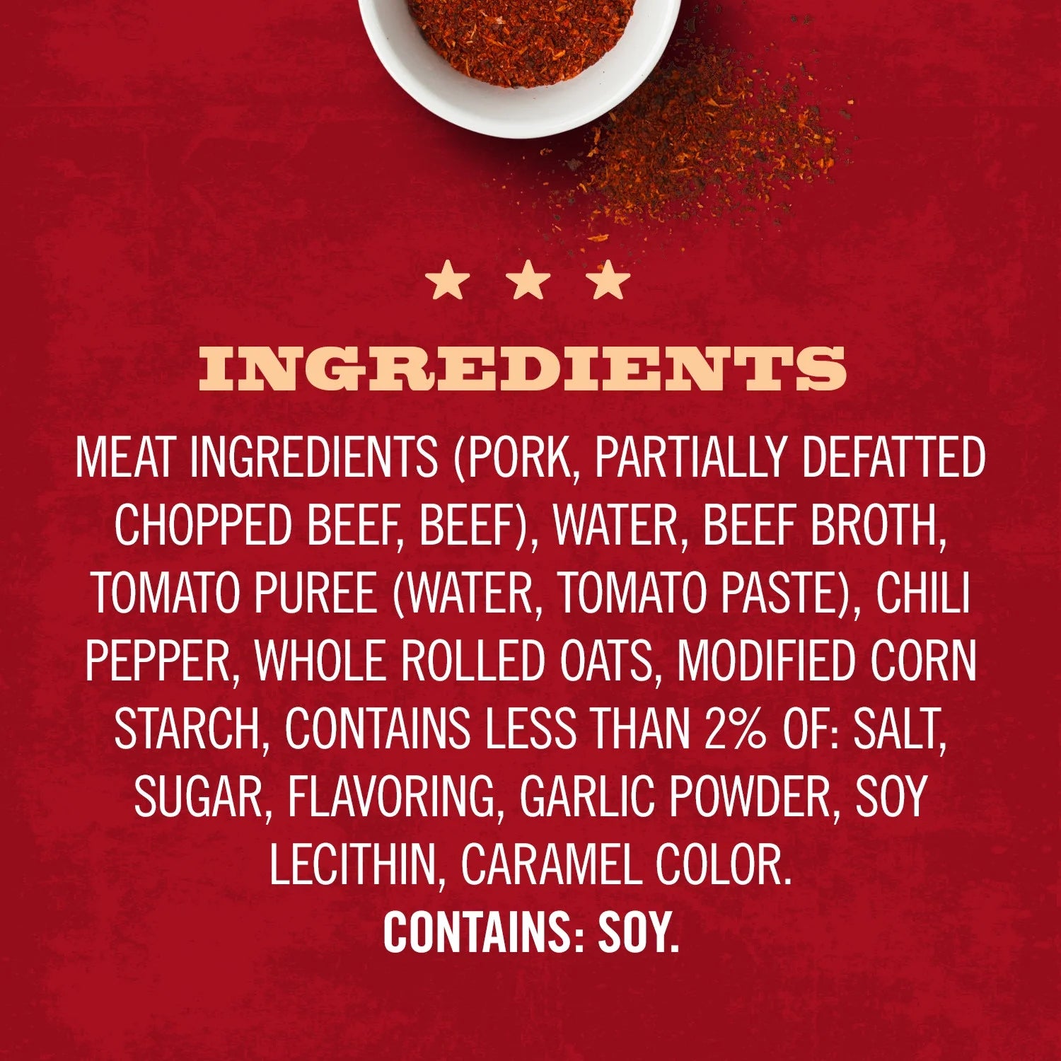 Meat Ingredients (Pork, Partially Defatted Chopped Beef, Beef), Water, Beef Broth, Tomato Puree (Water, Tomato Paste), Chili Pepper, Whole Rolled Oats, Modified Corn Starch, Contains less than 2% of: Salt, Sugar, Flavoring, Garlic Powder, Soy Lecithin, Caramel Color. CONTAINS: SOY./div>