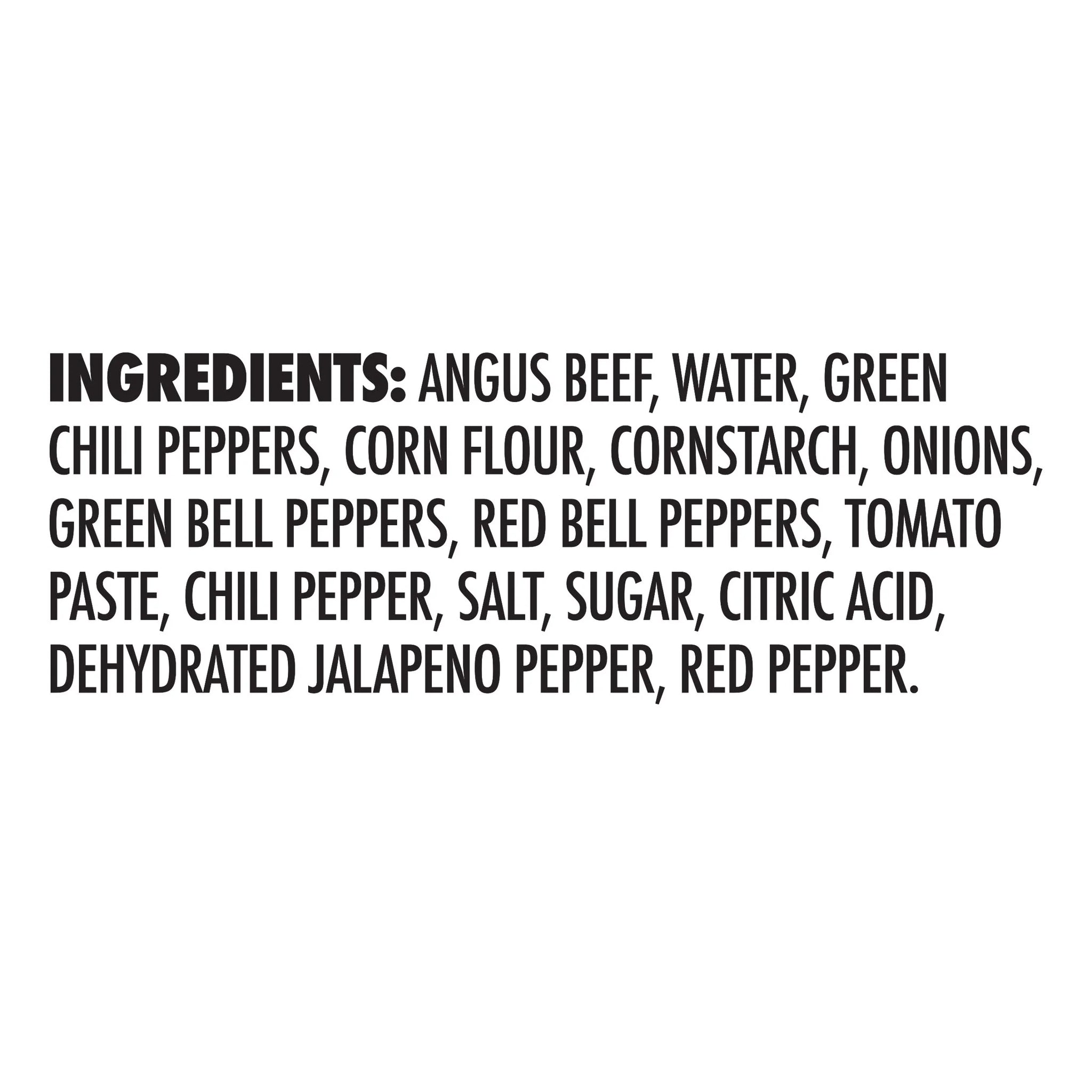 Ingredients: Angus Beef, Water, Green Chili Peppers, Corn Flour, Cornstarch, Onions, Green Bell Peppers, Red Bell Peppers, Tomato Paste, Chili Pepper, Salt, Sugar, Citric Acid, Dehydrated Jalapeno Pepper, Red Pepper./div>