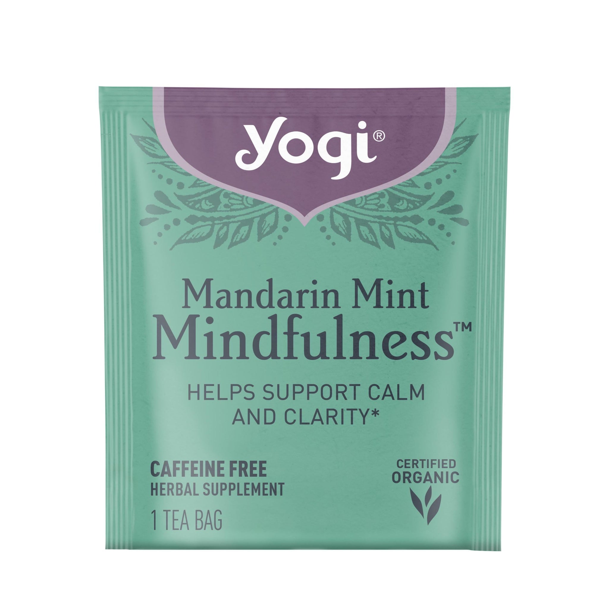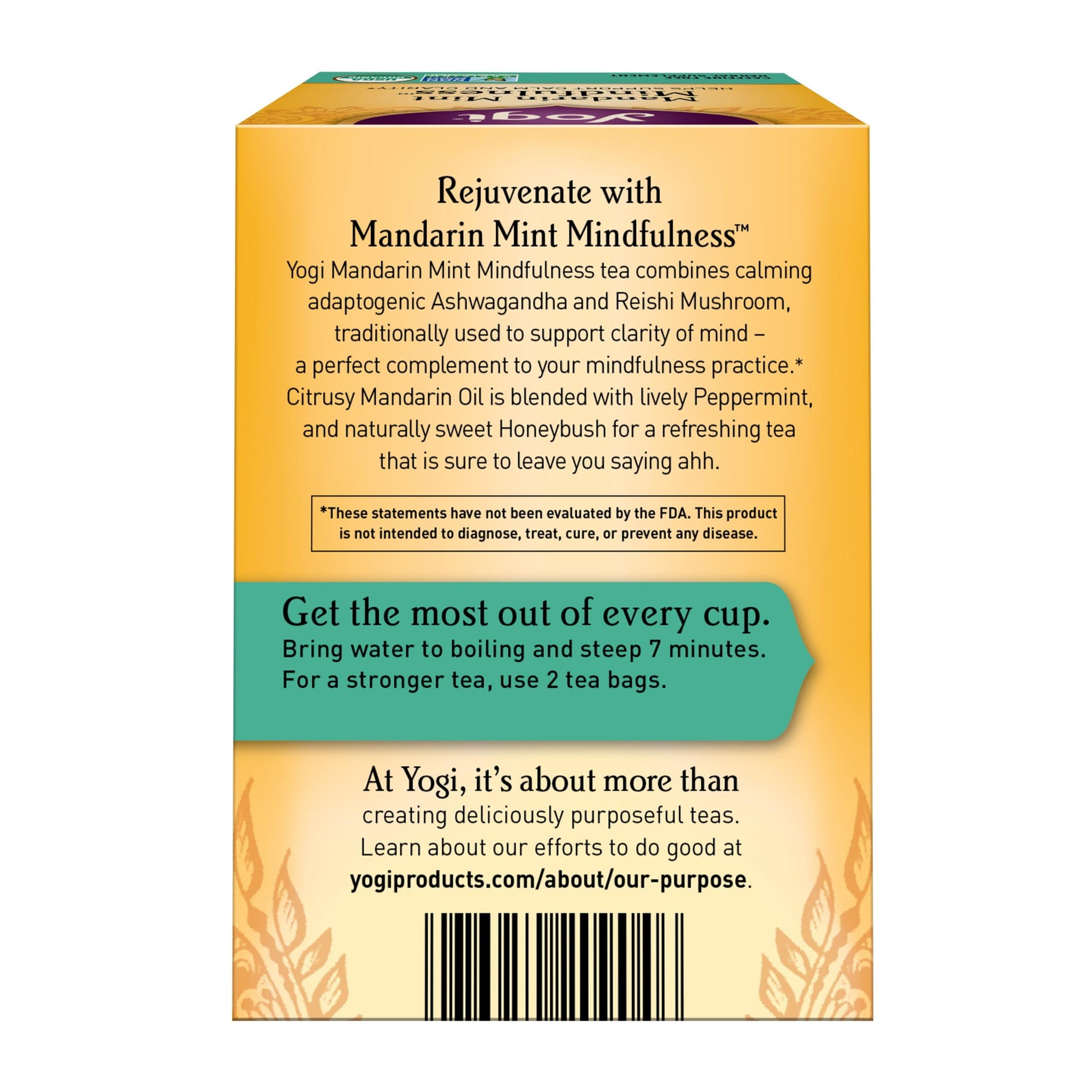 Yogi Tea Mandarin Mint Mindfulness combines calming adaptogenic Ashwagandha and Reishi Mushroom, traditionally used to support clarity of mind, making it the perfect tea to complement a mindfulness practice.* Citrusy Mandarin oil is blended with lively Peppermint, and naturally sweet Honeybush for a delicious and refreshing herbal tea. Enjoy a cup of Yogi Tea Mandarin Mint Mindfulness, a delightful caffeine free blend that is sure to leave you saying ahh. At Yogi, we believe in using the highest quality spices and botanicals from around the world, we're committed to sustainable practices by doing our part to protect and give back to the planet that gives us so much. Our tea bags are purposely blended with you in mind and care for the planet. Discover well-being that works for you. Find your flavor of well-being with Yogi tea.