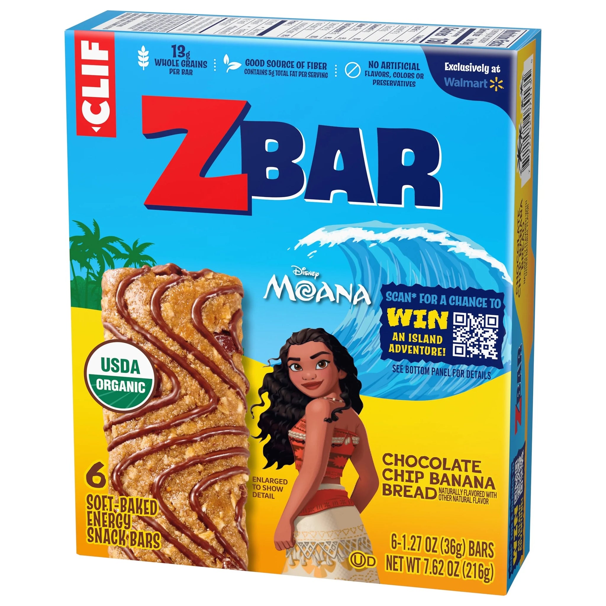 Crafted specially for active kids, Zbar (formerly CLIF Kid) granola bars are lunchbox-ready with a chewy, soft-baked texture in a variety of yummy flavors and a taste kids love. Made with ingredients like wholesome rolled oats, these USDA certified organic granola bars that feature Moana have 13 grams of whole grains per bar. Zbar Chocolate Chip Banana Bread soft-baked energy snack bars are USDA certified organic, non-GMO, kosher, and free from high-fructose corn syrup, artificial flavors, colors, and preservatives.