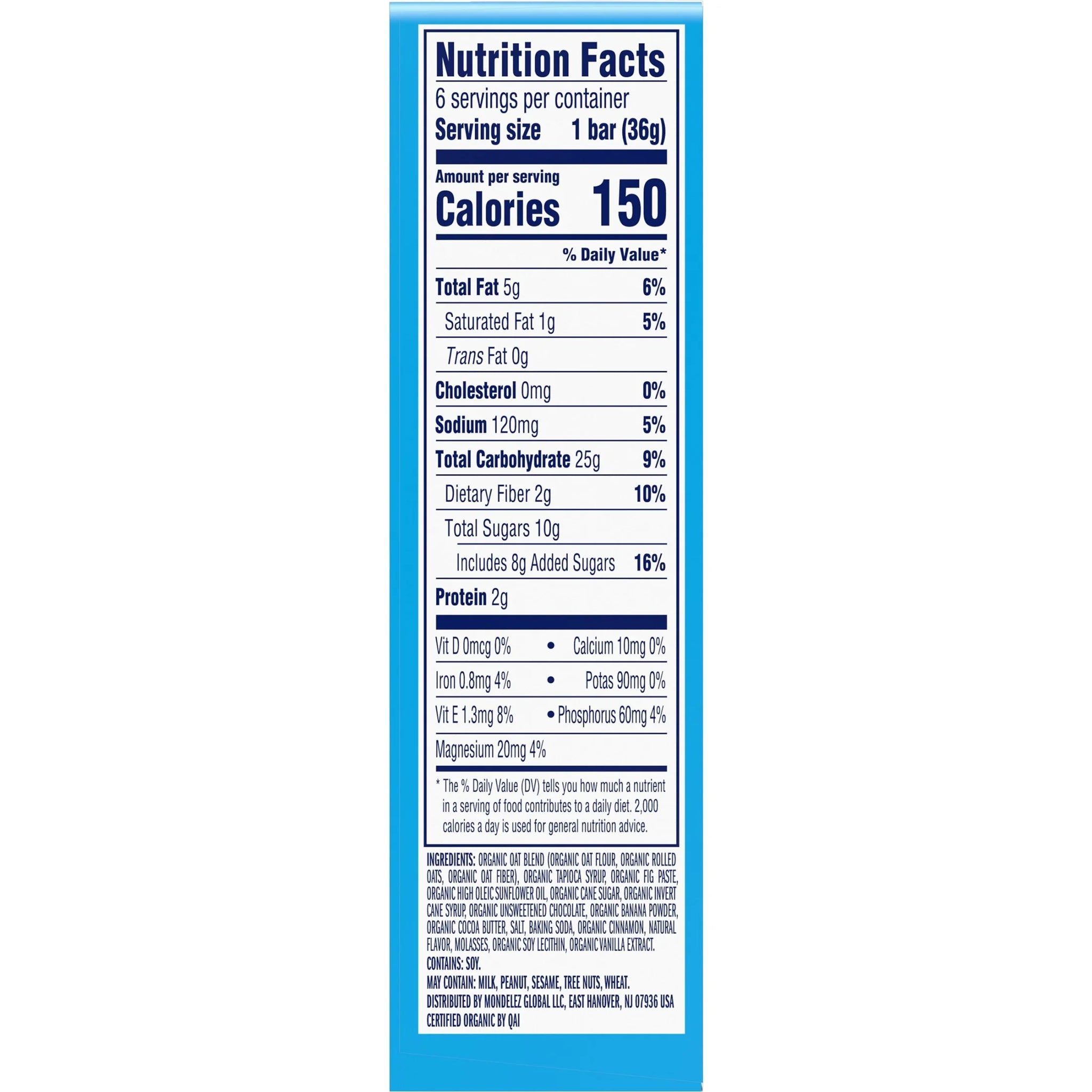Organic Oat Blend (Organic Oat Flour, Organic Rolled Oats, Organic Oat Fiber), Organic Tapioca Syrup, Organic Fig Paste, Organic High Oleic Sunflower Oil, Organic Cane Sugar, Organic Invert Cane Syrup, Organic Unsweetened Chocolate, Organic Banana Powder, Organic Cocoa Butter, Salt, Baking Soda, Organic Cinnamon, Natural Flavor, Molasses, Organic Soy Lecithin, Organic Vanilla Extract. Contains: Soy. May Contain: Milk, Peanut, Sesame, Tree Nuts, Wheat./div>