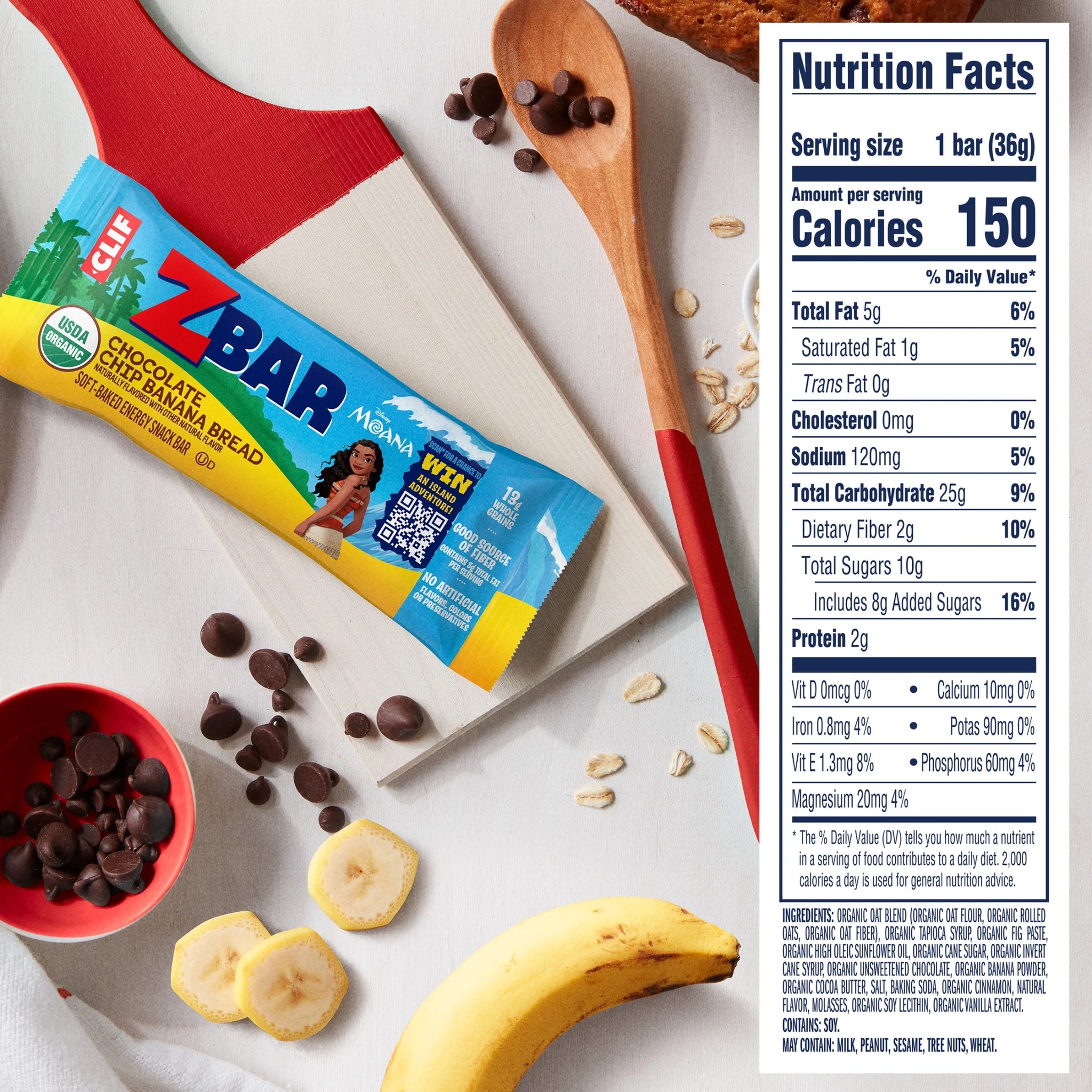 • DELICIOUS TASTE: Includes one 6-pack box of Zbar Chocolate Chip Banana Bread snack bars featuring Moana, with all the chewy texture and delicious taste of chocolate chip banana bread – in an organic granola bar! (packaging may vary)