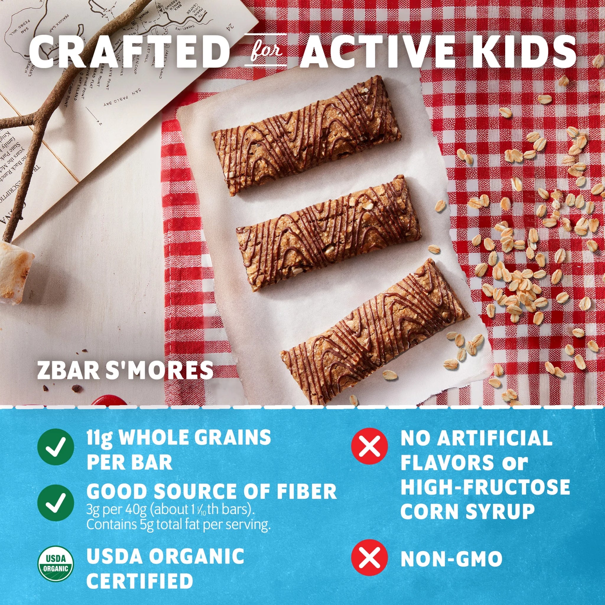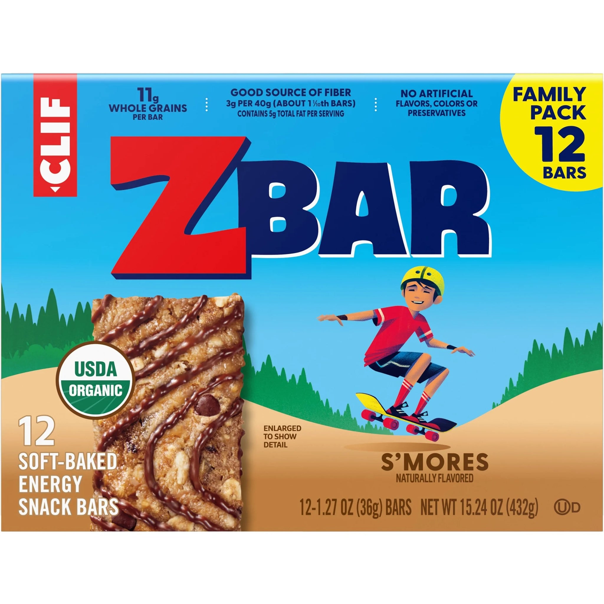 Crafted specially for active kids, Zbar S'mores Soft-Baked Energy Snack Bars are lunchbox-ready granola bars with a chewy, soft-baked texture and a taste kids love. Made with ingredients like wholesome rolled oats, these USDA certified organic granola bars have 11 grams of whole grains per bar with no high-fructose corn syrup and no artificial flavors, colors, or preservatives. Adventure needs fuel, and Zbar (formerly CLIF Kid Zbar) is a delicious, soft-baked energy snack bar in a variety of yummy flavors made with energizing, organic whole grain oats to fuel kids during play.