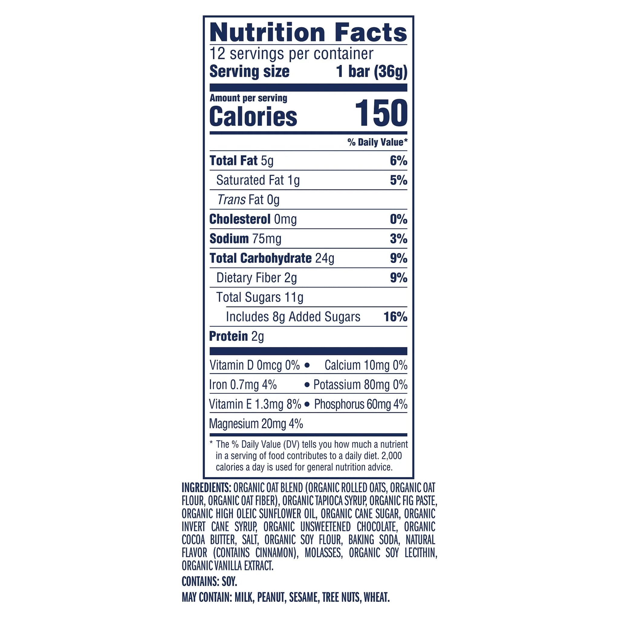 Ingredients: Organic Oat Blend (Organic Rolled Oats, Organic Oat Flour, Organic Oat Fiber), Organic Tapioca Syrup, Organic Fig Paste, Organic High Oleic Sunflower Oil, Organic Cane Sugar, Organic Invert Cane Syrup, Organic Unsweetened Chocolate, Organic Cocoa Butter, Salt, Organic Soy Flour, Baking Soda, Natural Flavor (Contains Cinnamon), Molasses, Organic Soy Lecithin, Organic Vanilla Extract. Contains: Soy. May Contain: Milk, Peanut, Sesame, Tree Nuts, Wheat./div>