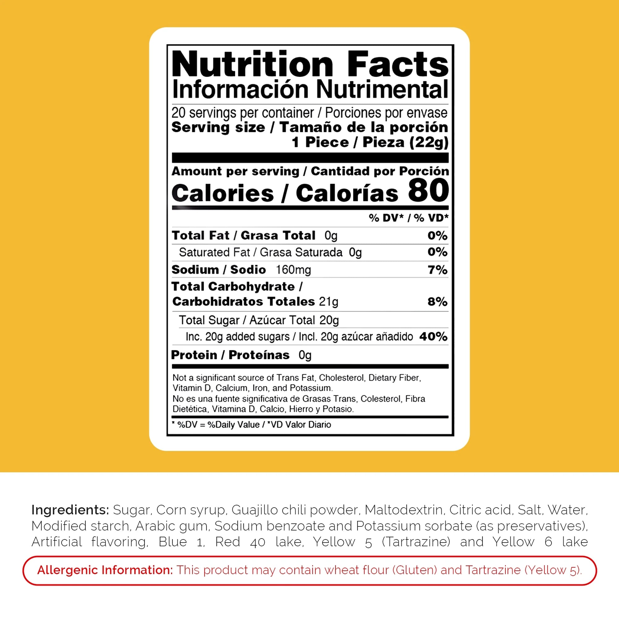 Sugar, Corn Syrup, Guajillo Chili Powder, Maltodextrin, Citric Acid, Salt, Water, Modified Starch, Arabic Gum, Sodium Benzoate and Potassium Sorbate (as Preservatives), Artificial Flavoring, Blue 1 Red 40 Lake, Yellow 5 (Tartrazine) and Yellow 6 Lake./div>
