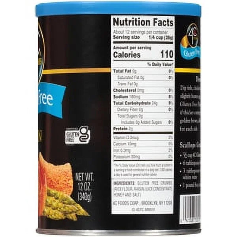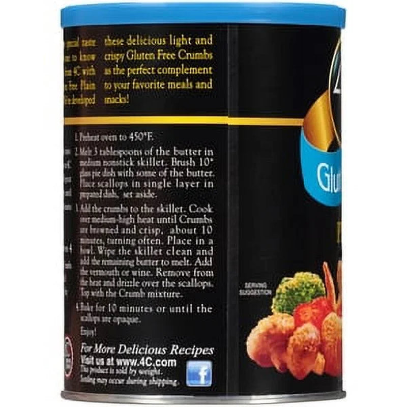 4C Guten Free Plain Bread Crumbs, 12 oz These gluten-free bread crumbs are suitable for a wide variety of meal applications, including succulent meatballs, stuffings and cutlets. They help to provide your food with satisfyingly crunchy exteriors. Make yourself some delicious deep-fried dishes as well. Combine them with your very own spices to take them even further. NET WT 12 oz (340g) For delicious recipes visit us at www.4C. 4C: of quality. Serving Size: 1/4 Cup (28g) Servings per container: about 12