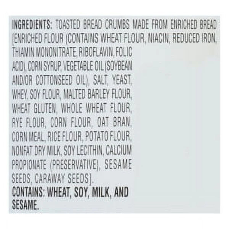 Toasted Bread Crumbs made from Enriched Bread [Enriched Flour (contains Wheat Flour, Niacin, Reduced Iron, Thiamin Mononitrate, Riboflavin, Folic Acid), Corn Syrup, Partially Hydrogenated Vegetable Oil Shortening (Soybean and/or Cottonseed Oil), Salt, Yeast, Whey, Soy Flour, Malted Barley Flour, Wheat Gluten, Whole Wheat Flour, Rye Flour, Corn Flour, Oat Bran, Corn Meal, Rice Flour, Potato Flour, Nonfat Dry Milk, Soy Lecithin, Calcium Propionate (preservative), Sesame Seeds, Caraway Seeds]./div>