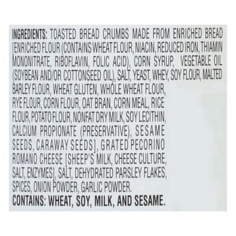 Toasted Bread Crumbs Made from Enriched Bread [Enriched Flour, (Contains Wheat Flour, Niacin, Reduced Iron, Thiamin Mononitrate, Riboflavin, Folic Acid), Corn Syrup, Vegetable Oil (Soybean and/or Cottonseed Oil), Salt, Yeast, Whey, Soy Flour, Malted Barley Flour, Wheat Gluten, Whole Wheat Flour, Rye Flour, Corn Flour, Oat Bran, Corn Meal, Rice Flour, Potato Flour, Nonfat Dry Milk, Soy Lecithin, Calcium Propionate (Preservative), Sesame Seeds, Caraway Seeds], Grated Pecorino Romano Cheese [Pasteurized Sheep's Milk, Cheese Culture, Salt, Enzymes], Salt, Dehydrated Parsley Flakes, Spices, Onion Powder, Garlic Powder./div>
