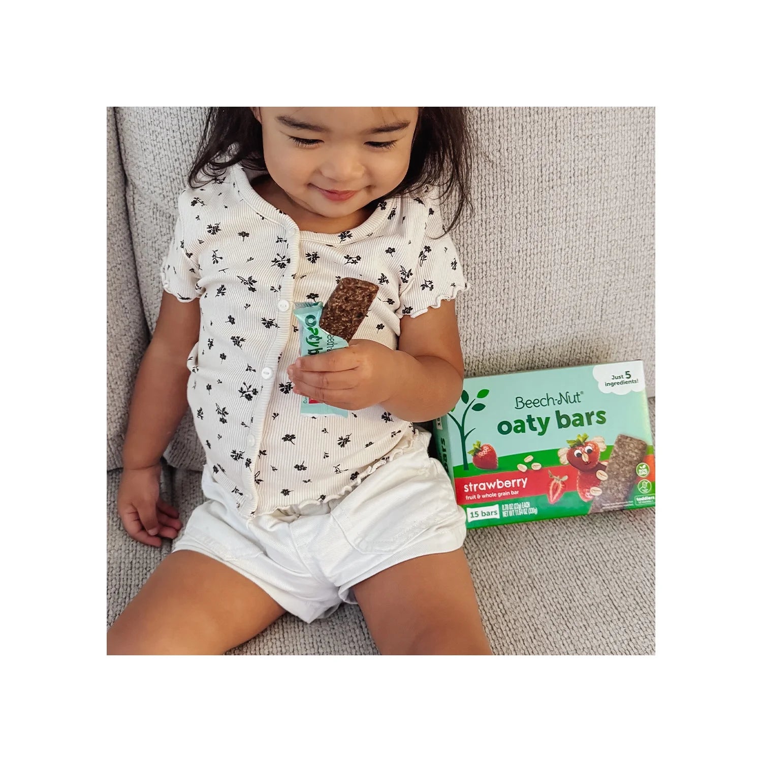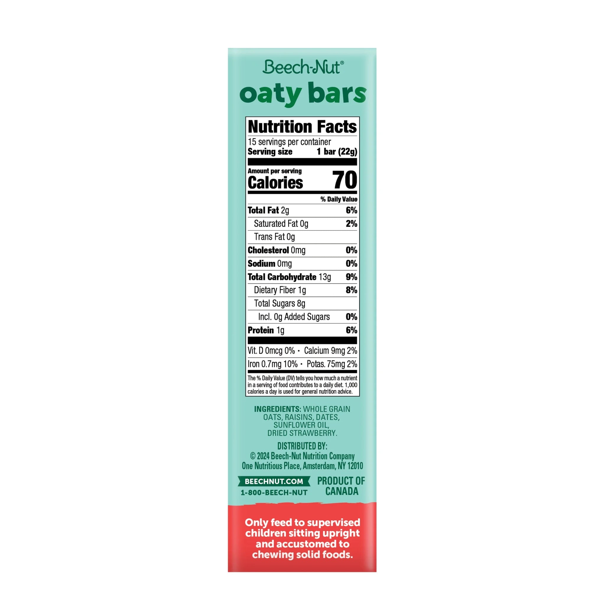 Delicious strawberry adds just the right amount of sweetness to our simple take on the classic granola bar. With fruit, whole grains and no artificial preservatives, colors or flavors, our Beech-Nut Strawberry Oaty Bars are a go-to snack for toddlers. Softer than traditional granola bars, our Oaty Bars are also gluten-free, non-GMO and made with only 5 ingredients. Free of the following allergens: dairy, gluten, peanut, soy, egg. As a stage 4 snack, this bar is ideal for children 12 months and up. This product should only be fed to seated, supervised children who are accustomed to chewing solid foods.