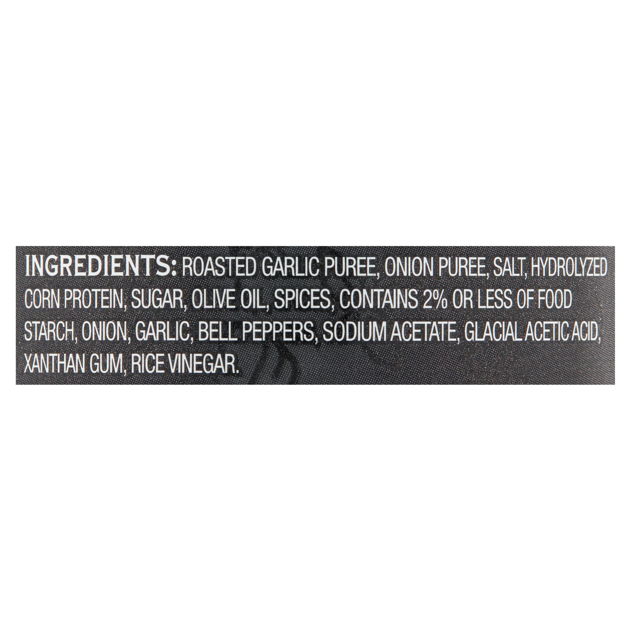 Roasted Garlic Puree, Onion Puree, Salt, Hydrolyzed Corn Protein, Sugar, Olive Oil, Spices, Contains 2% or less of Food Starch, Onion, Garlic, Bell Peppers, Sodium Acetate, Glacial Acetic Acid, Xanthan Gum, Rice Vinegar/div>