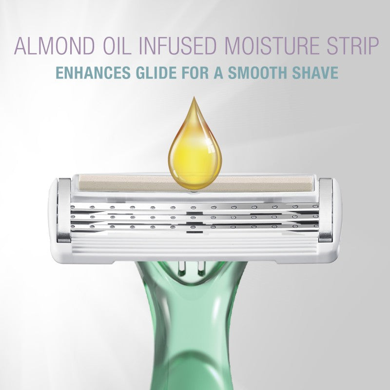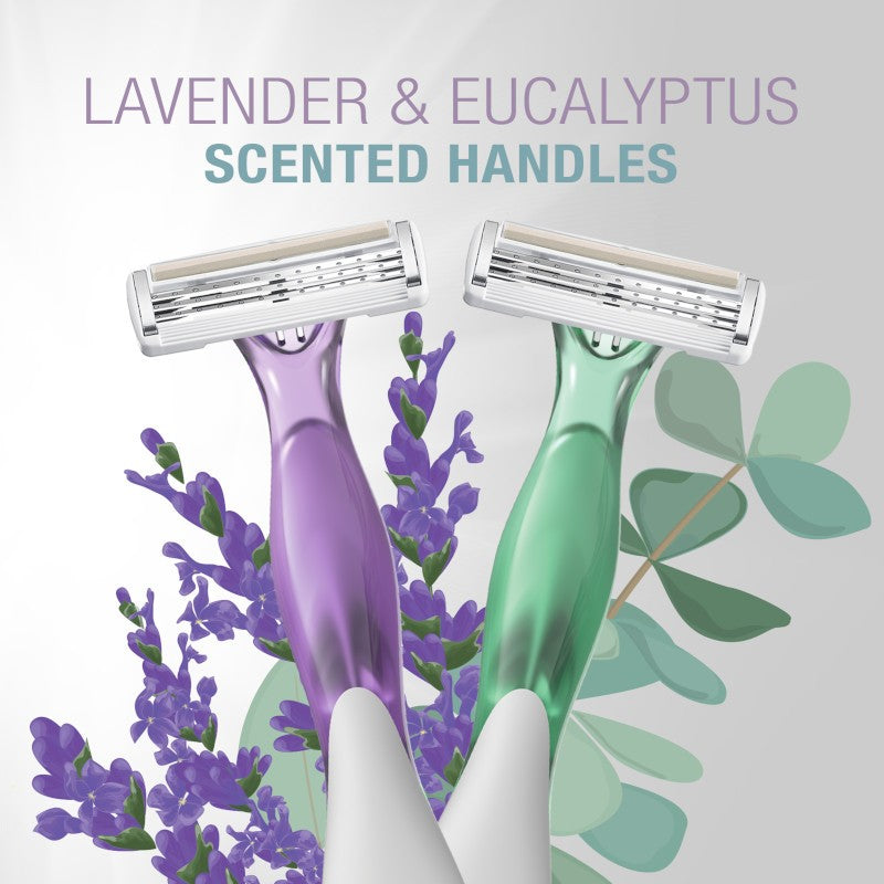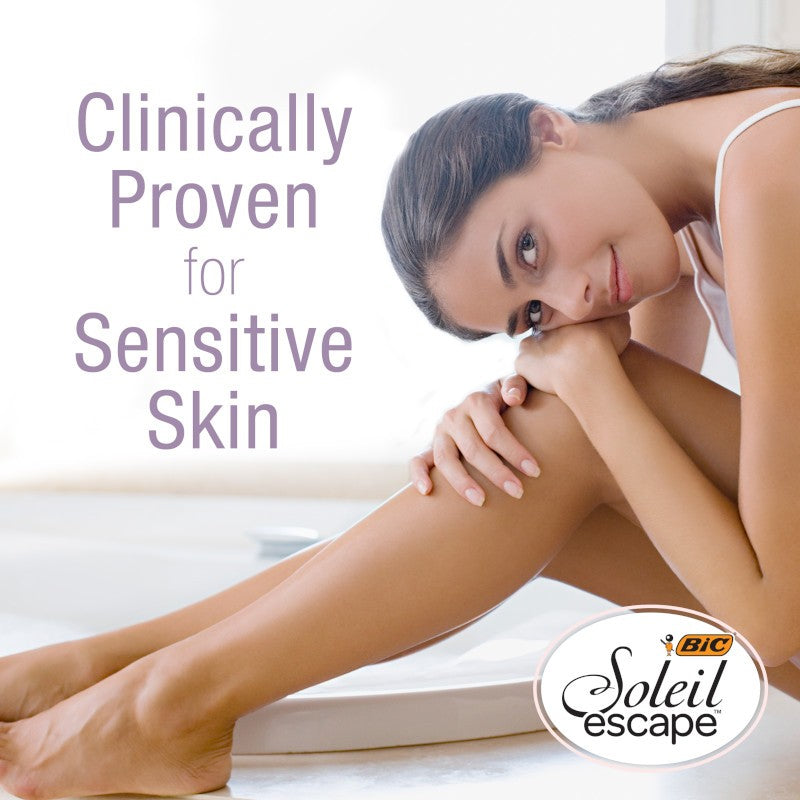 Create an immersive sensorial experience with BIC Soleil Escape women's disposable razors. These women's razors have 3 flexible blades that individually adjust to the contours of your skin for a smooth and comfortable shave whether you're using it to shave your legs, armpits or other parts of your body.What we love about this BIC Soleil razor is the moisturizing strip with 100% natural almond oil that enhances glide for a smooth shave. Even better? Soleil Escape 3 blade razors are clinically proven for sensitive skin. Soleil women's razors for body also have long-lasting lavender and eucalyptus scented handles that are perfect for creating a scent-sational experience during your shave session. These bulk disposable razors come in a 12-pack that fit easily into a gym or travel bag so you can bring them wherever you go!