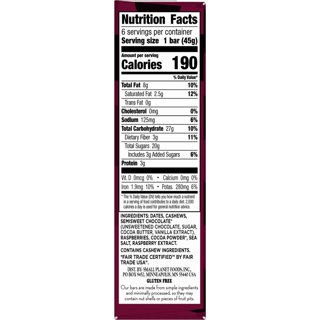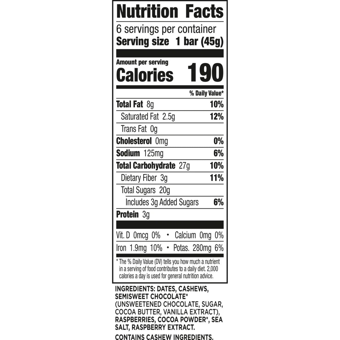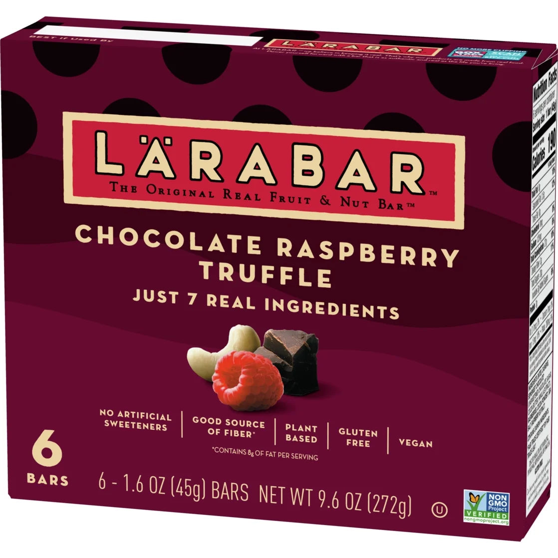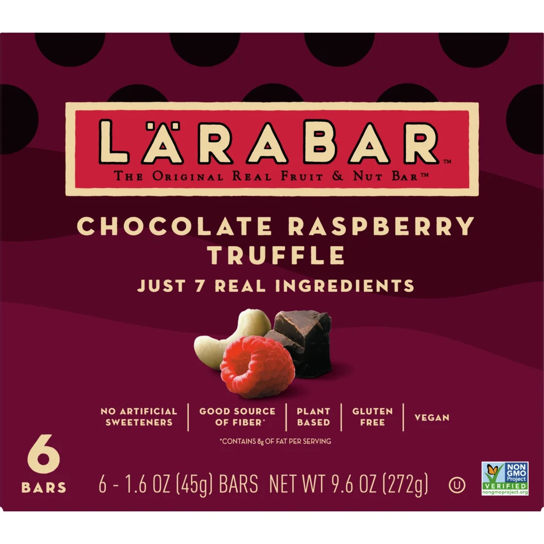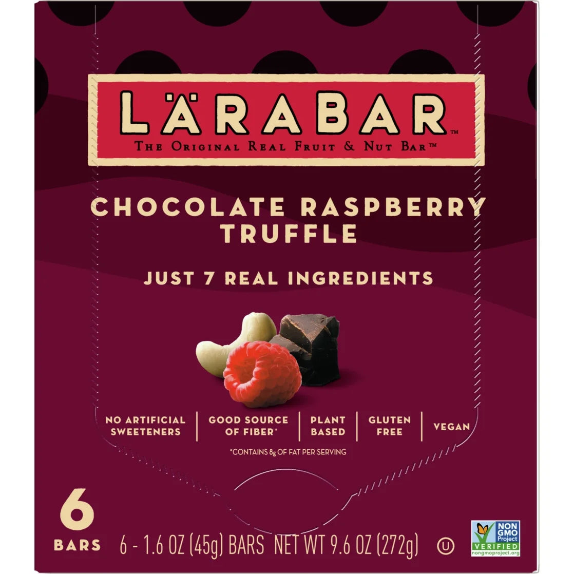 Real ingredients never tasted so good! Larabar Chocolate Raspberry Truffle Fruit and Nut Bars are sweet, tasty, and chewy - and contain just seven real ingredients. You'll love the mix of dates, cashews, semisweet chocolate (Fair Trade Certified), raspberries, cocoa powder (Fair Trade Certified), sea salt, and raspberry extract that deliver big flavor in a convenient bar. Whether it's part of your morning or an afternoon snack, Larabar Chocolate Raspberry Truffle bars are an easy and delicious option you can feel good about eating. These bars are made without artificial sweeteners, and are also plant based, gluten free, vegan, Non-GMO Project Verified, dairy free, and kosher. Plus, they have a good source of fiber (contains 8g of fat per serving). All of that in a simple, wholesome bar. Real indulgence just got easier with this crave-worthy blend of fruit, nuts, and chocolate. 100% Real. 100% Delicious. Contains one 9.6 oz regular cardboard box of Larabar Chocolate Raspberry Truffle, Gluten Free and Vegan Fruit and Nut Bars, 6 Ct; perfect for instant snacking.