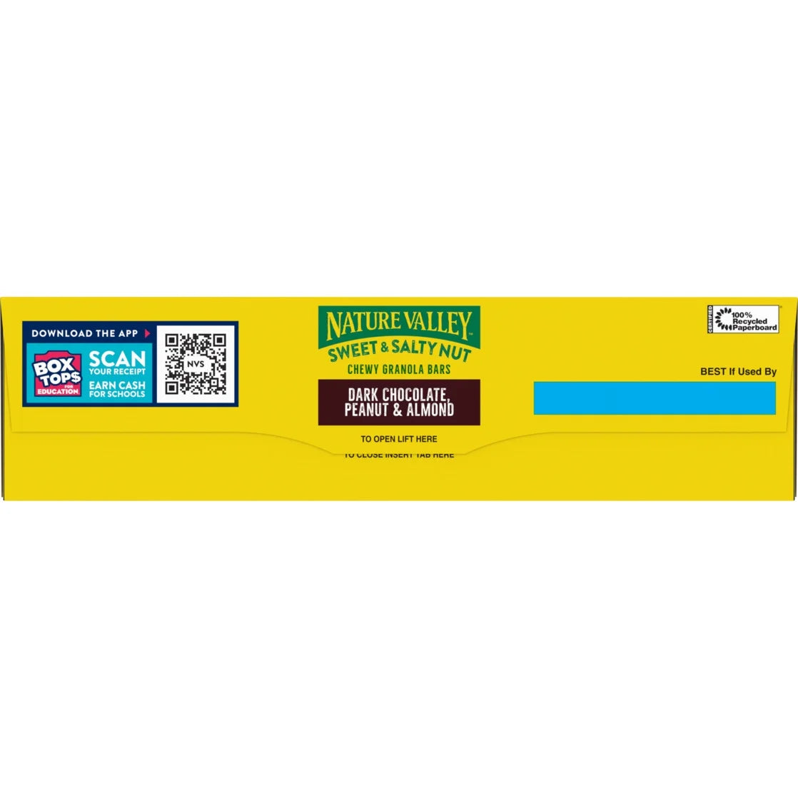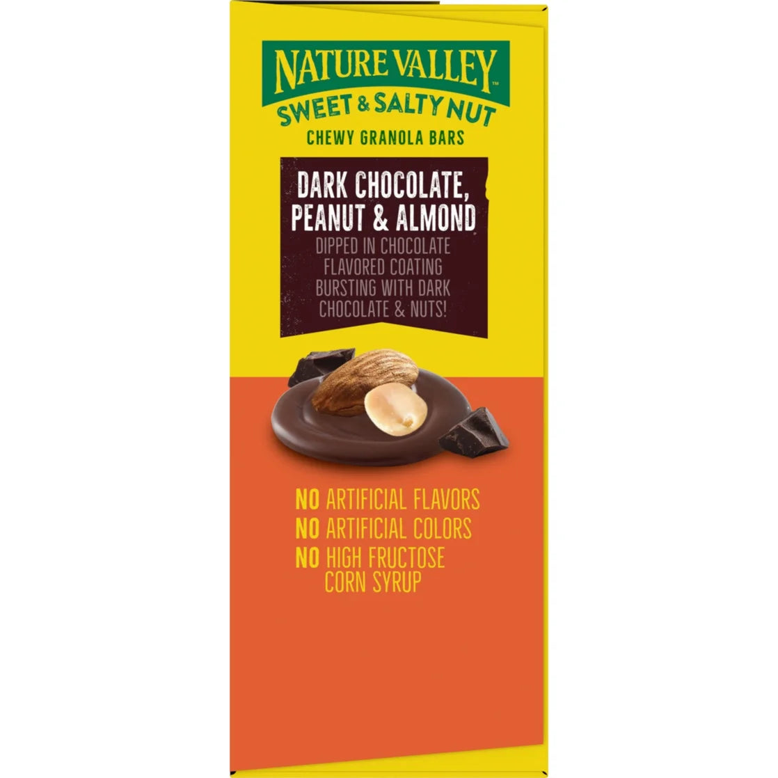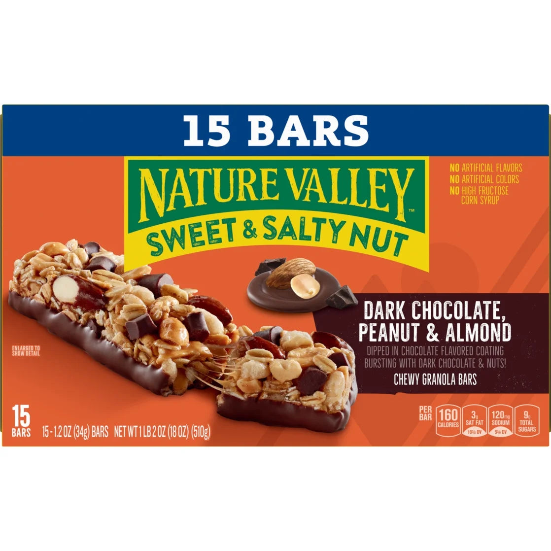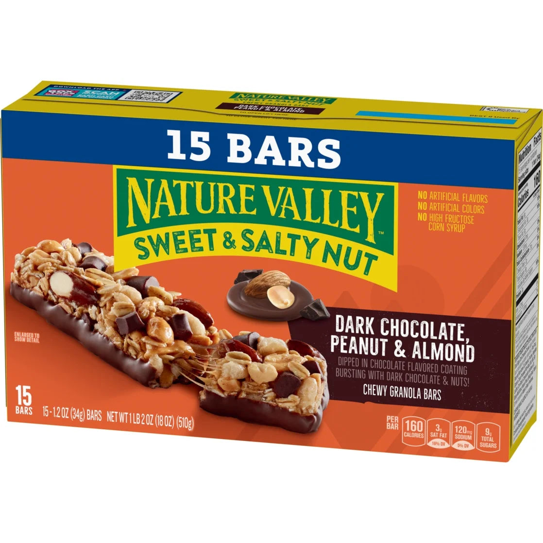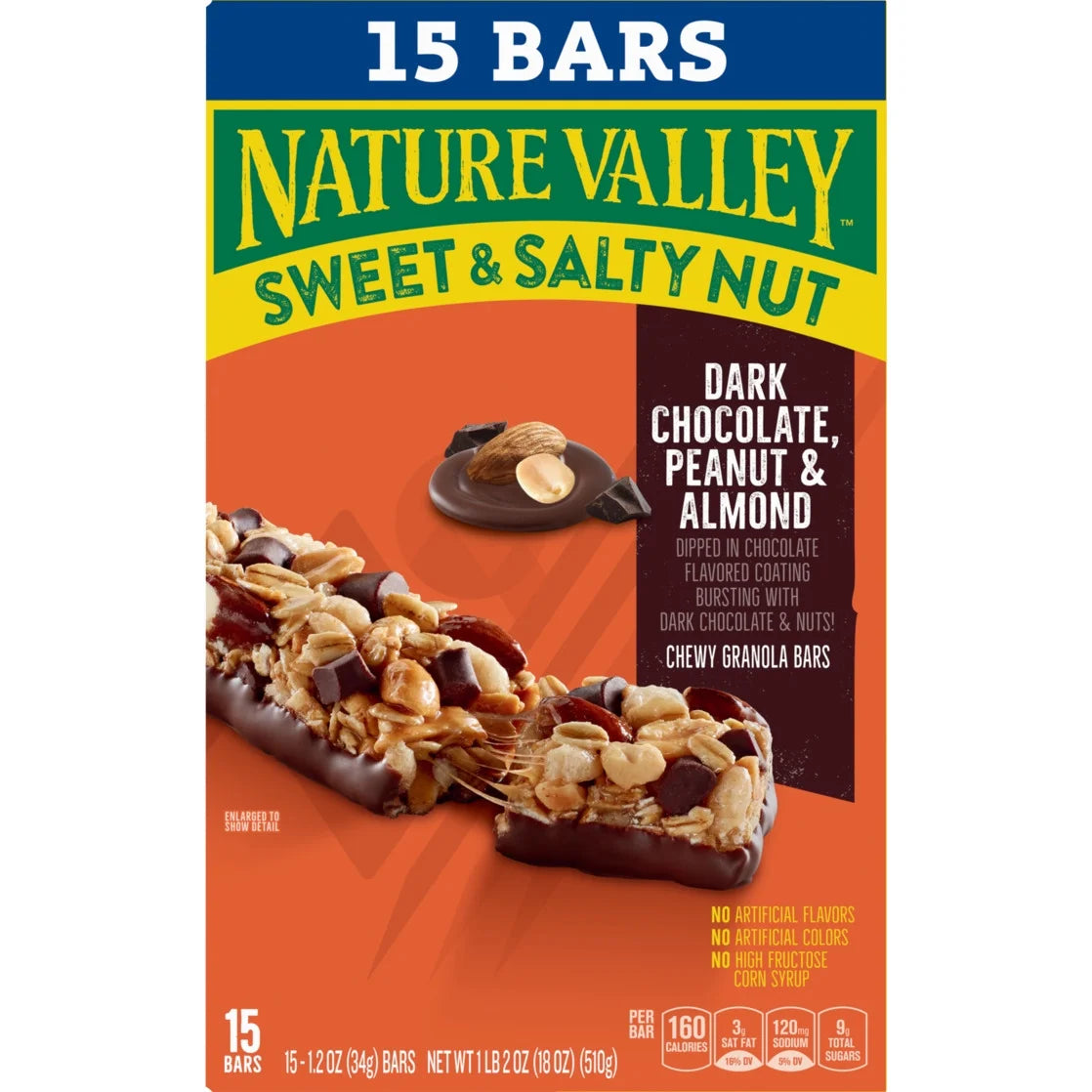 - CONTAINS: One big cardboard box of Nature Valley Sweet and Salty Nut Bars, Dark Chocolate, Peanut and Almond, 15 Bars, 18 oz; Perfect for instant snacking